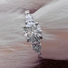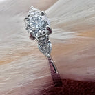 Three stone rings are classic and this 1 ct round center with pear side stones gives this ring a modern twist.