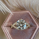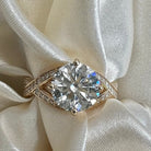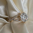 This incredibly cut hearts and arrows round center diamond fits perfectly in this yellow cross over band. Set low to the finger creating a big beautiful without getting in the way.