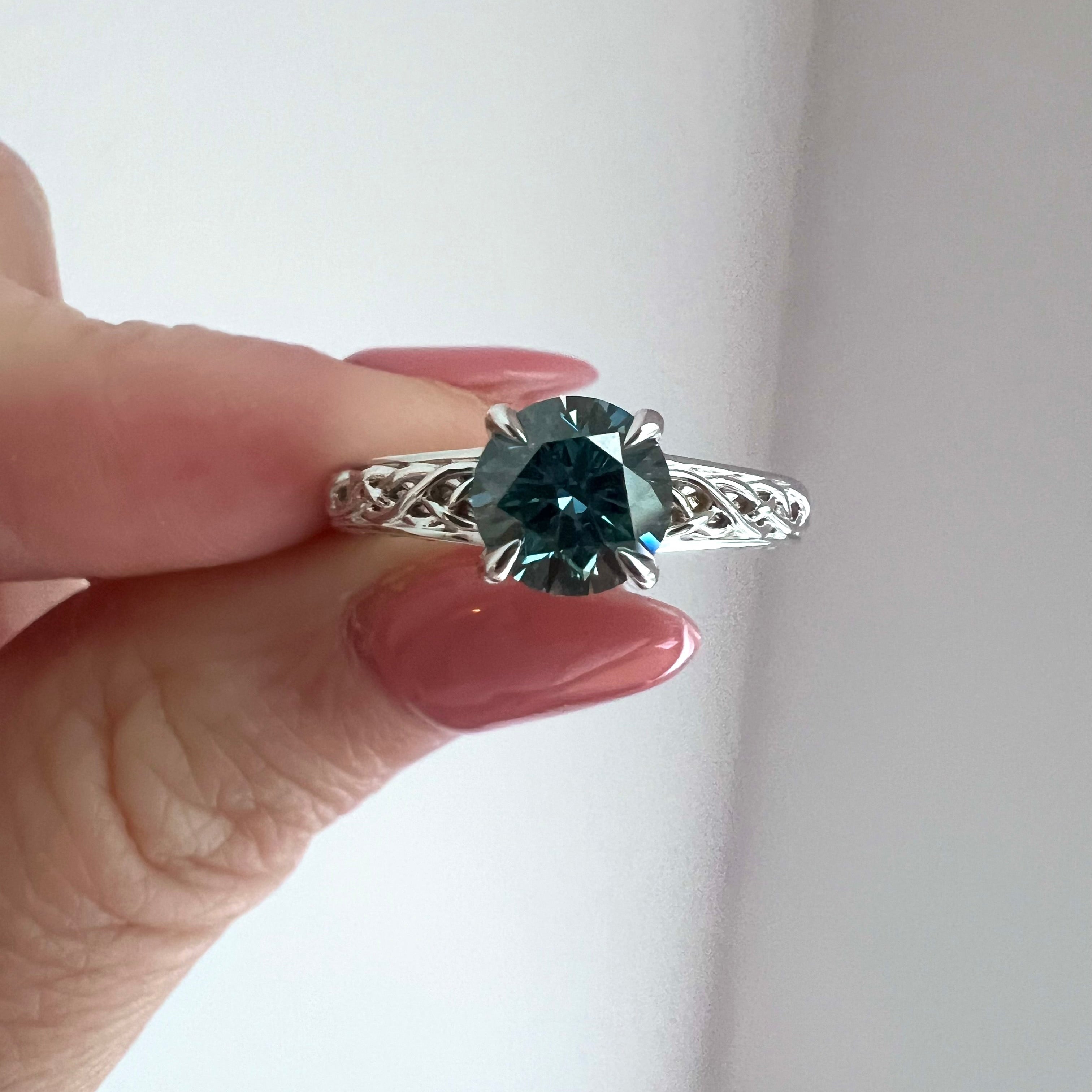 This customer knew exactly what she wanted when we met. She wanted a ring that she felt better represented her favorite disney princess, Merida. She wanted a diamond that matched the color of her dress with celtic knots on the top and sides of the band. The ring wouldn't be complete without an engraved arrow on the inside of the band. We brought her vision to life and couldn't be happier with how it turned out.