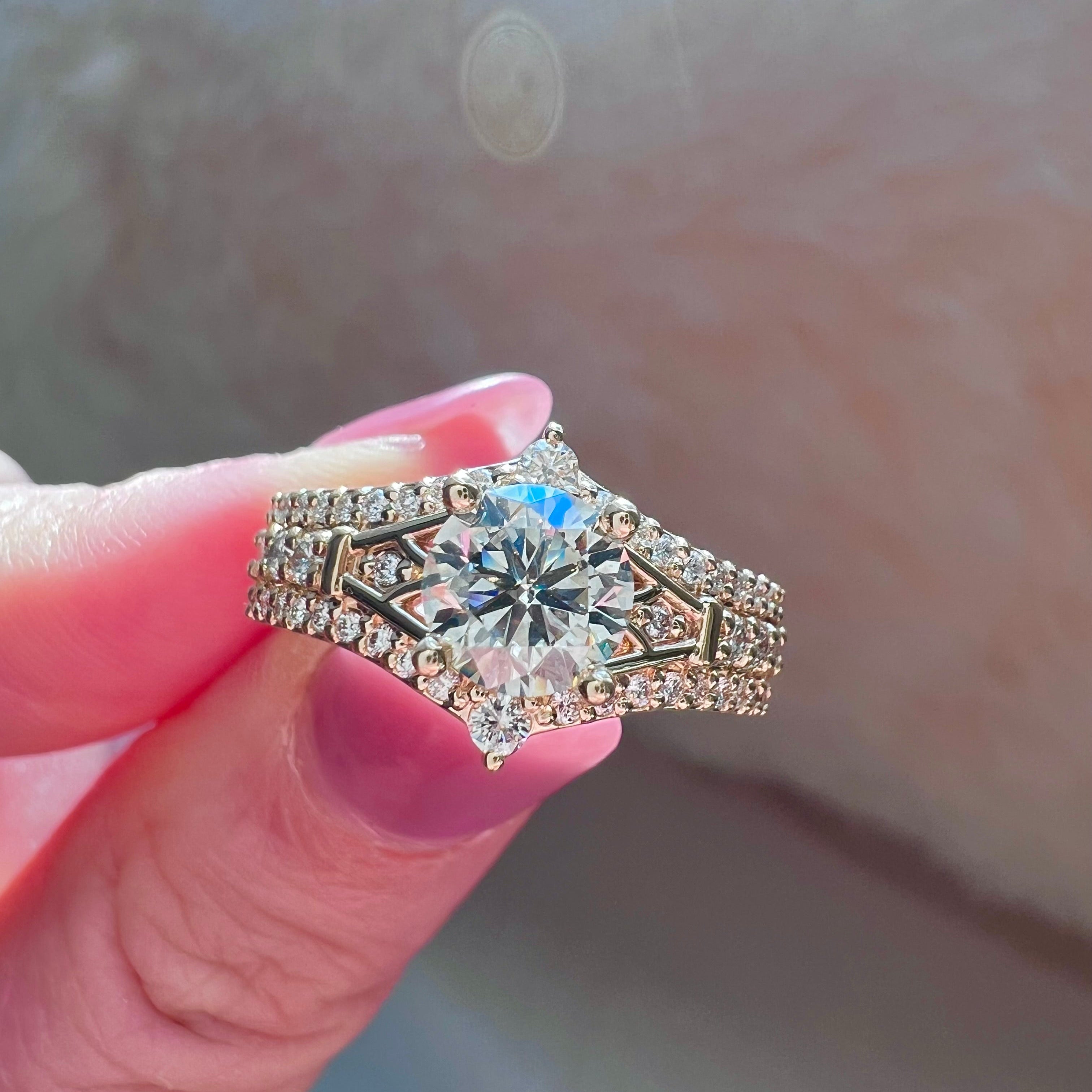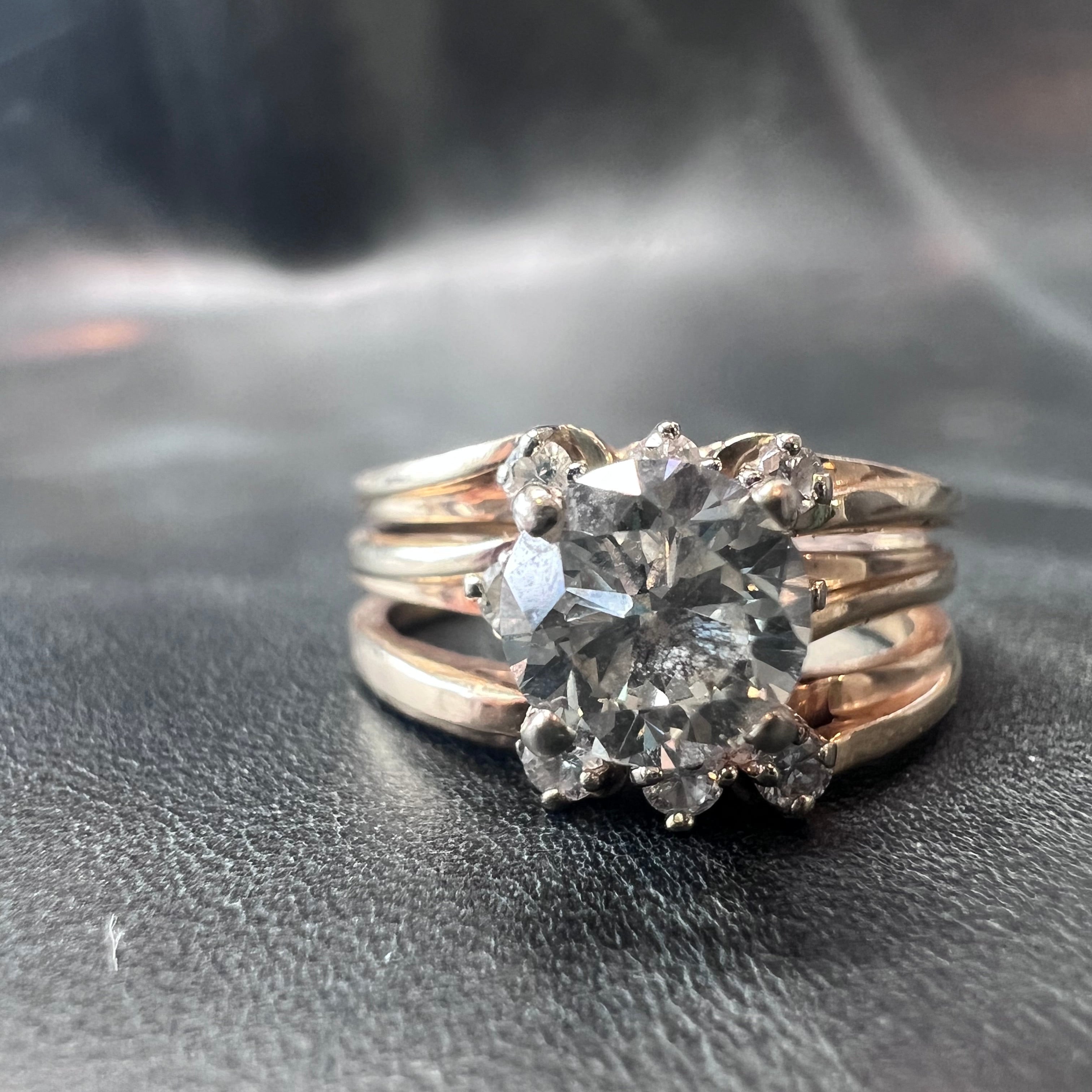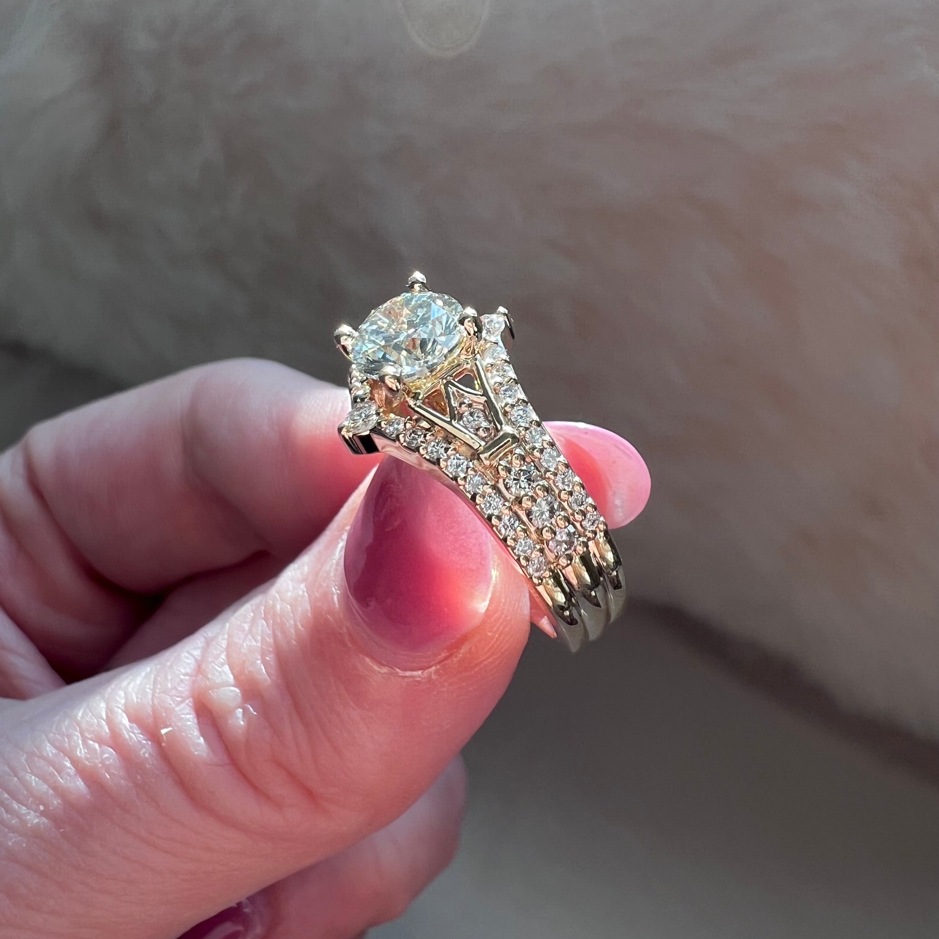 Before image below showing 3 soldered rings for their first 40 years of marriage. After seeing our vintage inspired style she wanted to create her own version. It was important that it still looked like 3 rings but was actually only 1. Using the 3 larger diamonds from the original ring in the "wedding band" points and 3 on each side in the center. We added new diamonds that went in the vintage side detail and the "wedding bands" to line up with the original diamonds in the center band.