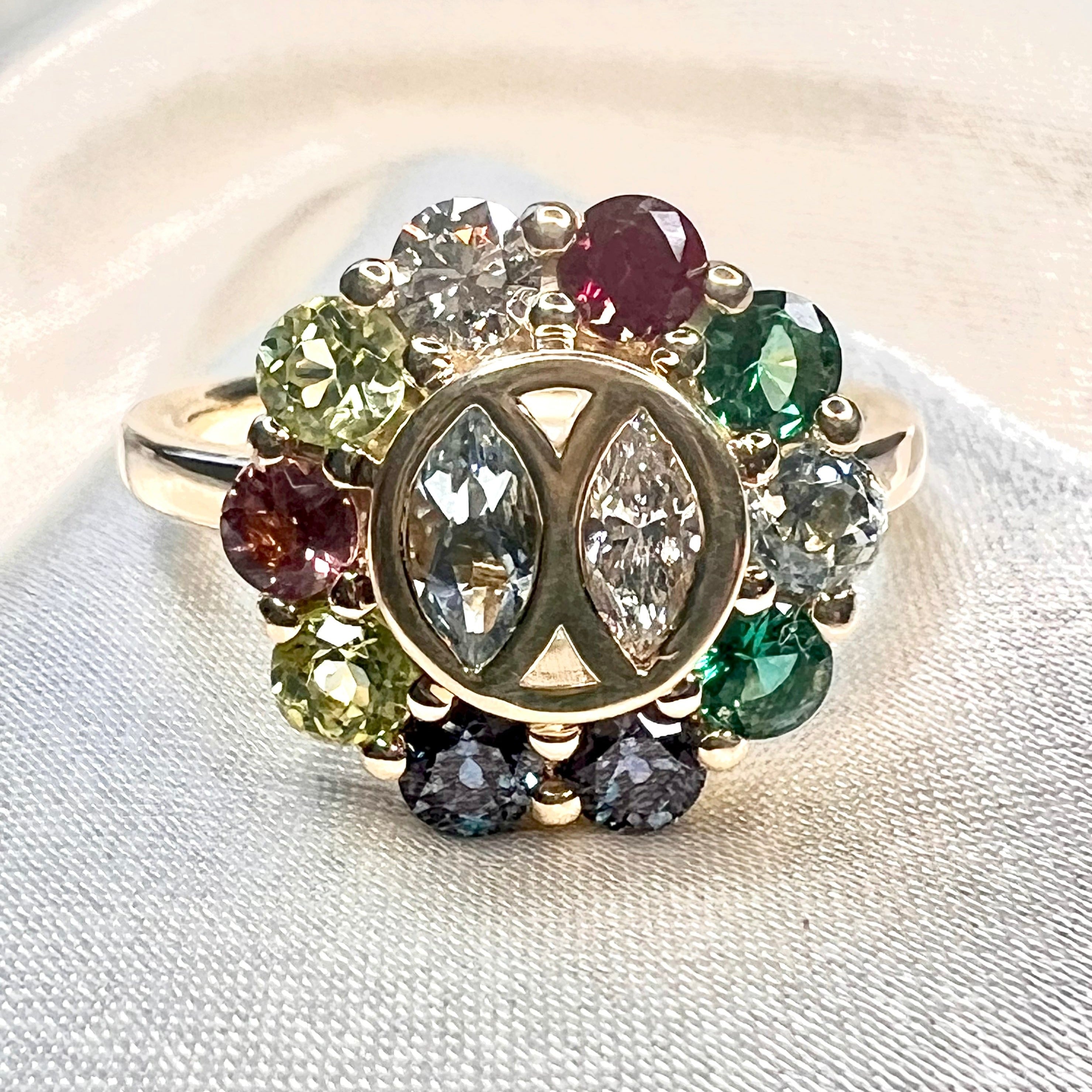 This couple came to me with a pretty good idea of what they wanted in their ring to celebrate their golden anniversary. They knew they wanted the birthstones for themselves in the middle and the birthstones of their children and grandchildren around it. The placement of each stone was well thought out before we met. They wanted a circle to represent the circle of life and the life they built together. The only part they couldn't figure out was how to put two stone in the middle of the circle. That is when we came up with two bezel set marquise stones with pierced out triangles. The love these two have for each other is obvious and I was honored to be able to work with them on such a special project.