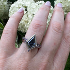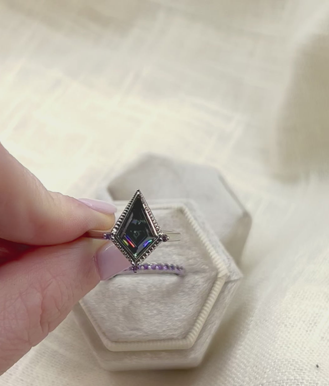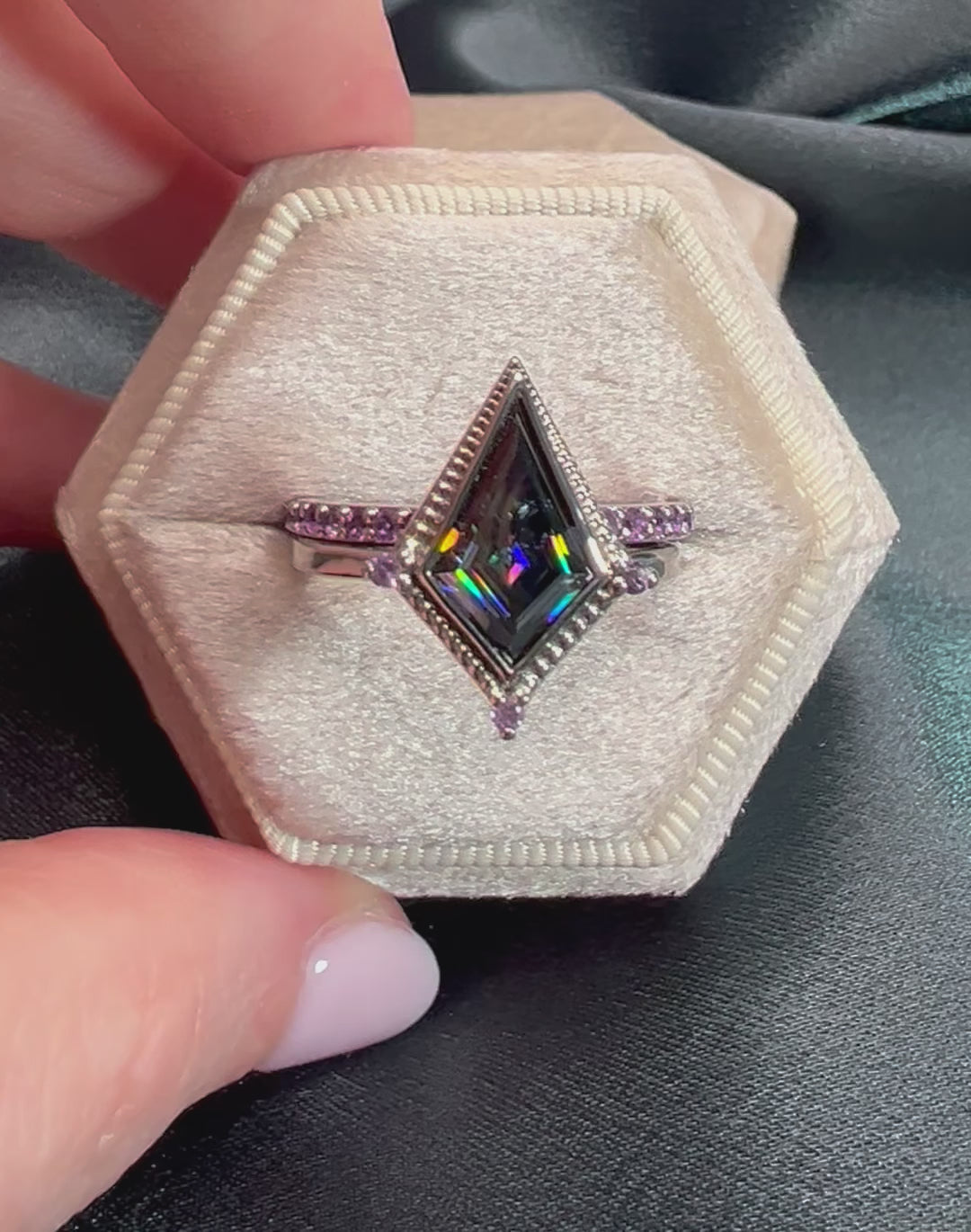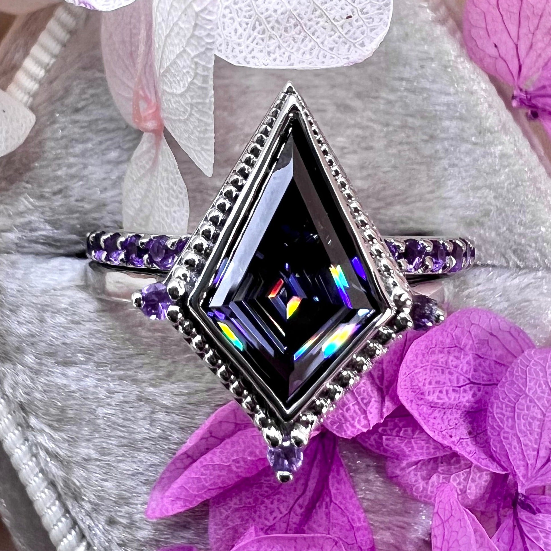 2 carat custom cut kite shaped moissanite. Dark gray moissanite is an excellent alternative to black diamonds. It is a dark stone but still has fiery flashes of color giving it a lot of character. The wedding band and accent stones are amethyst to complete this nontraditional wedding set.
