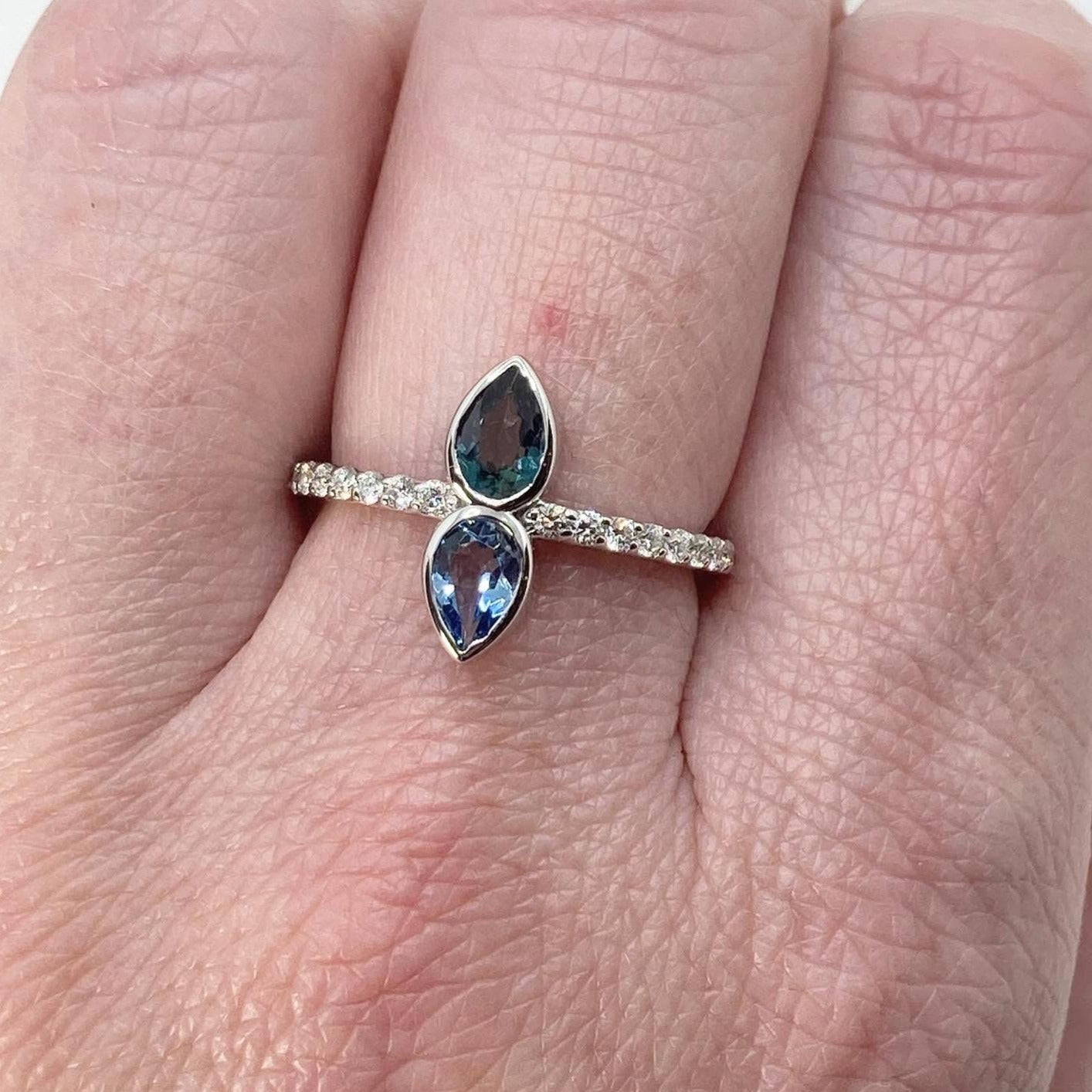 This ring features one of the most rare natural gem stones, Alexandrite (June). Alexandrite is known for its color changing properties changing from a green/blue to purple/red depending on the light. This Alexandrite is paired perfectly with a natural Aquamarine (March). Accenting the birthstones are 23 diamonds which marks the years between the births of her two kids. Getting to know each customer makes it easier to find ways to incorporate symbolism into the design. During the first appointment we discuss why you want to make a custom piece and what is most important to you.