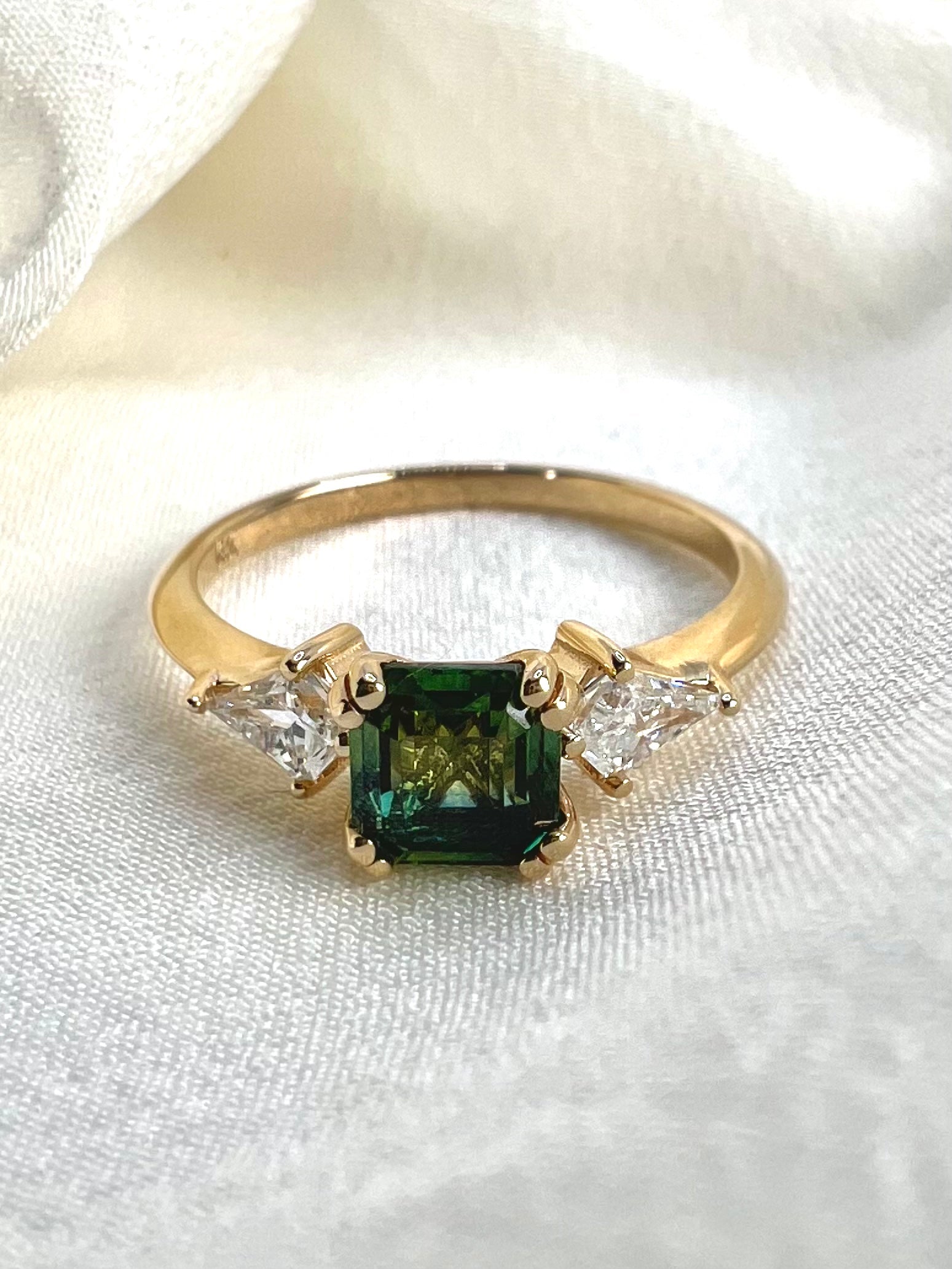 SOLD but similar ring can be custom ordered. Price will very based on sapphire. Pictured is a gorgeous Asscher cut parti sapphire displaying flashes of yellow and blue. Sapphire is .98 Carat. Lab grown kite shaped diamonds F VS1 .38 total diamond carat weight. Delicate, yet sturdy 14k yellow gold band creating a gentle knife edge tapering to the kite side stones. Double prongs make for the final touch on this one of a kind engagement ring.