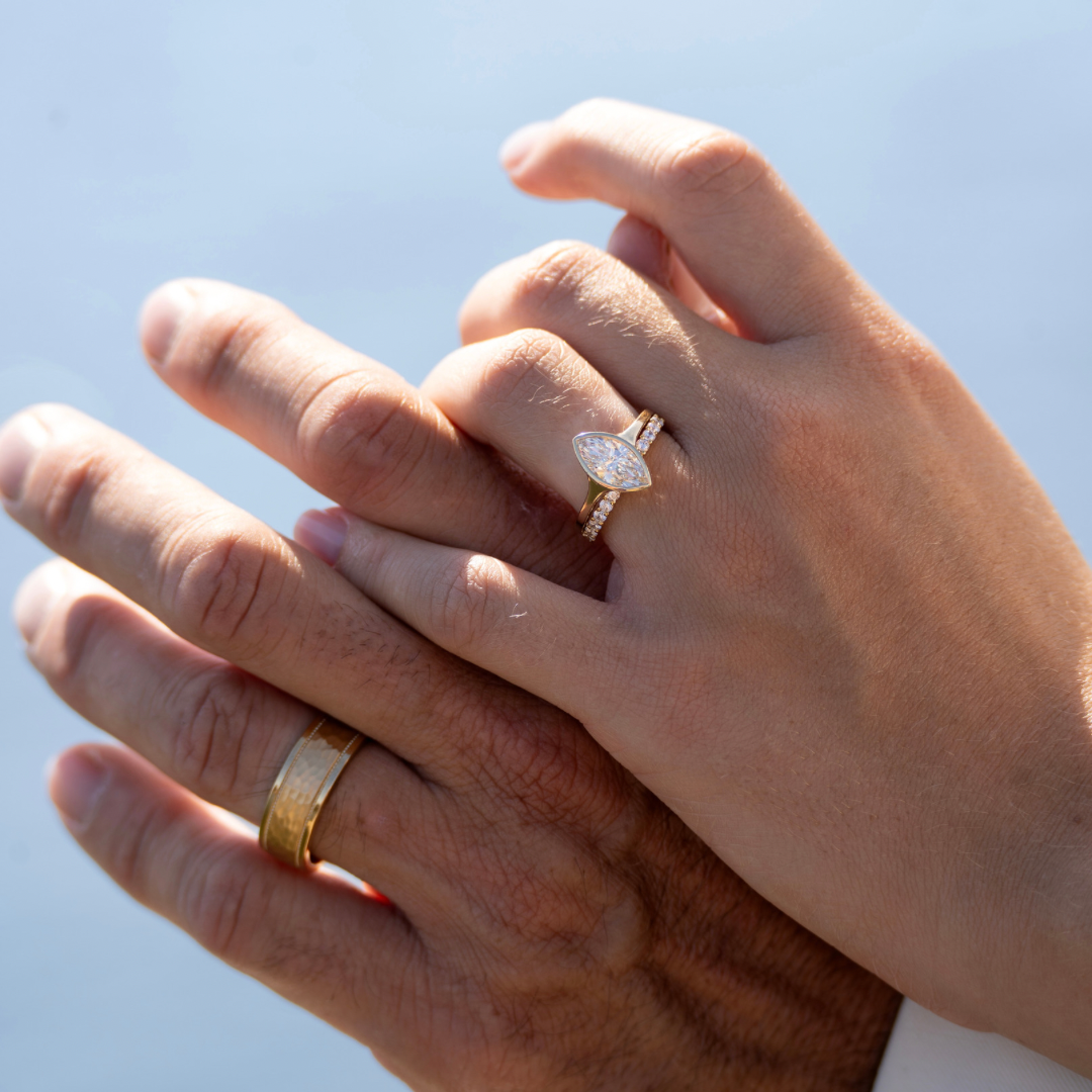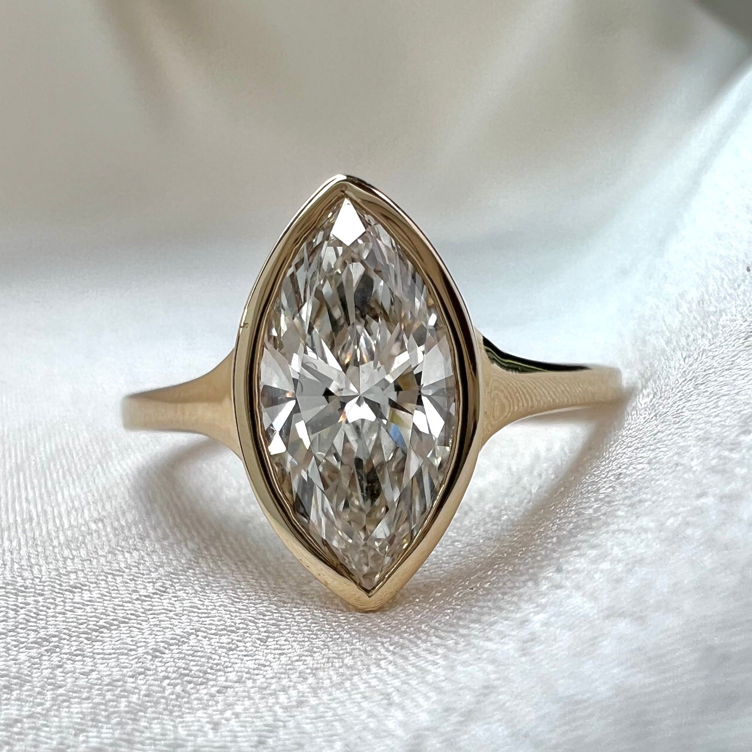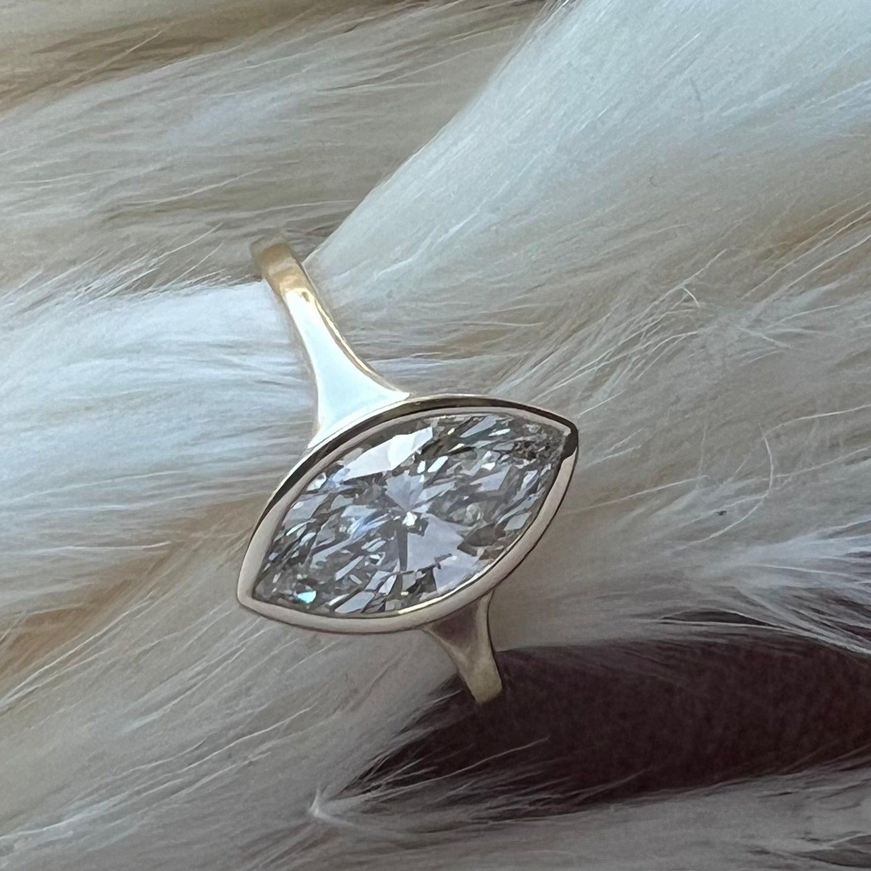 SOLD- Currently available for made to order. Images are 1.57ct G VS1 Certified Marquise Diamond set in a modern bezel setting. This has been designed for a wedding band to sit flush under the center stone.