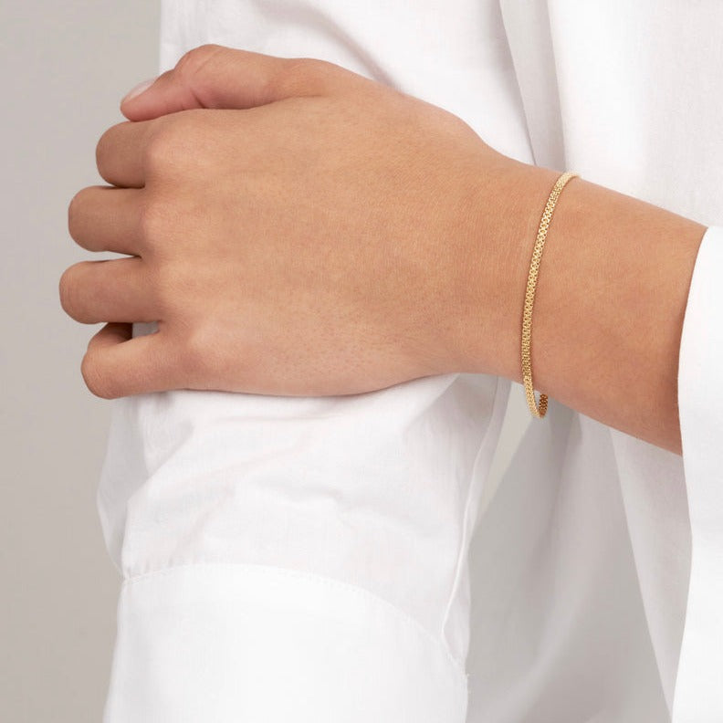 14k Yellow Gold Bismark Bracelet. Light weight and perfect for everyday wear.2.5mm wide with lobster clasp.