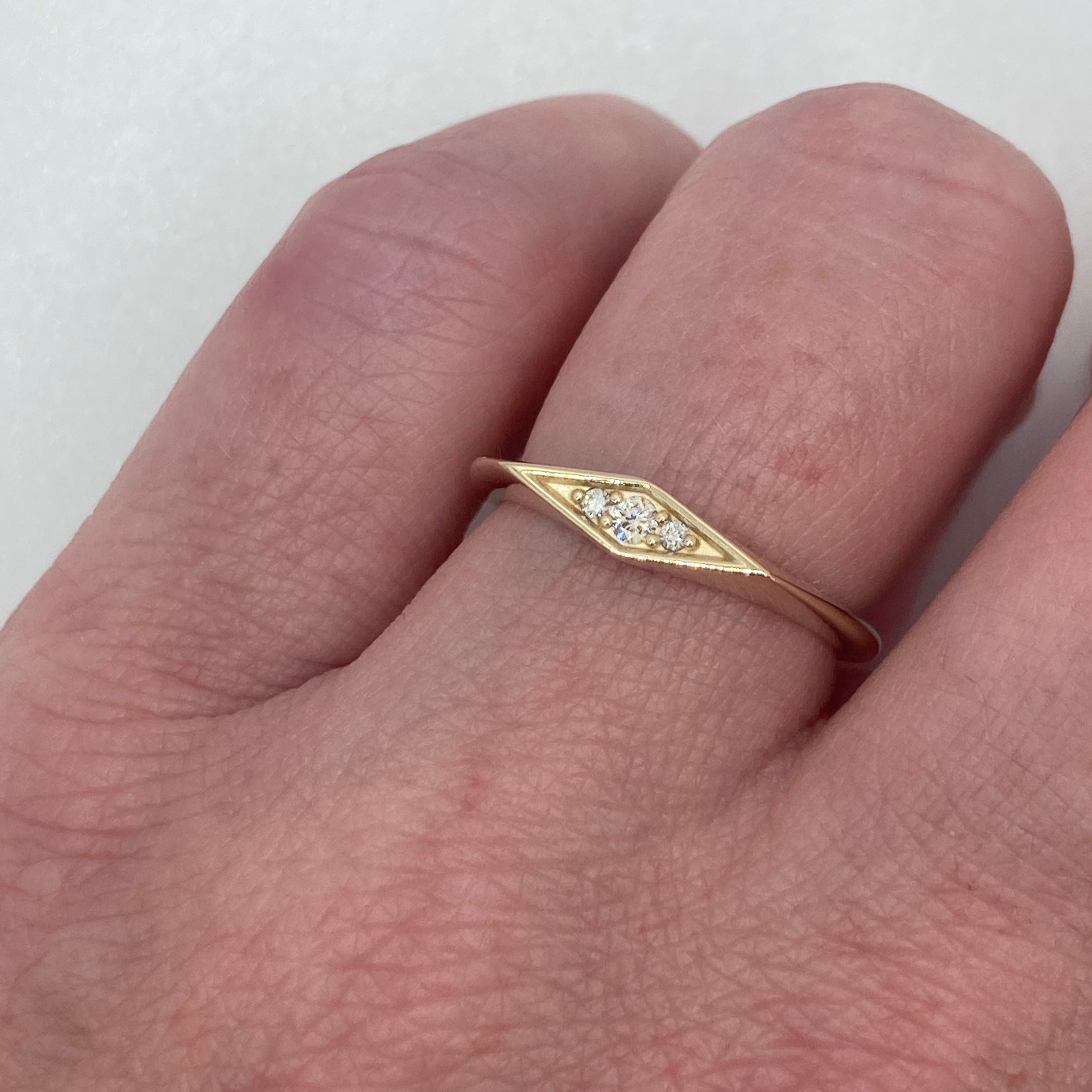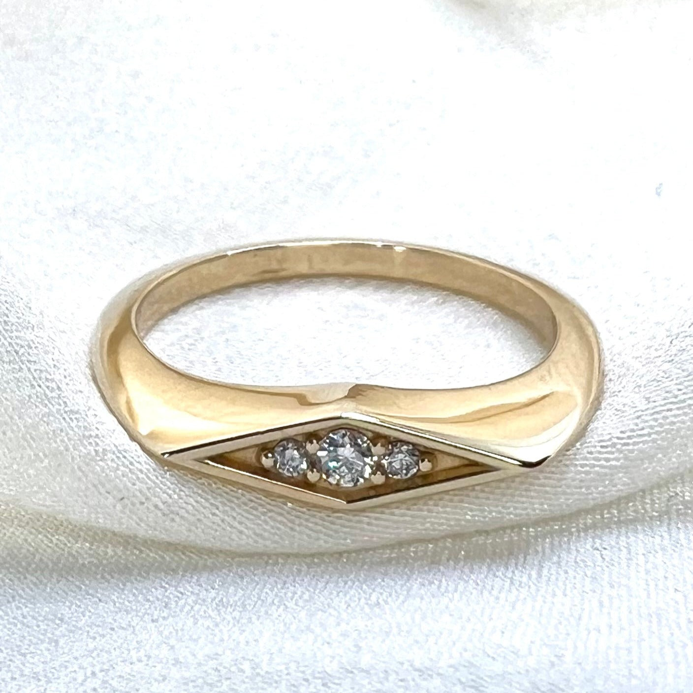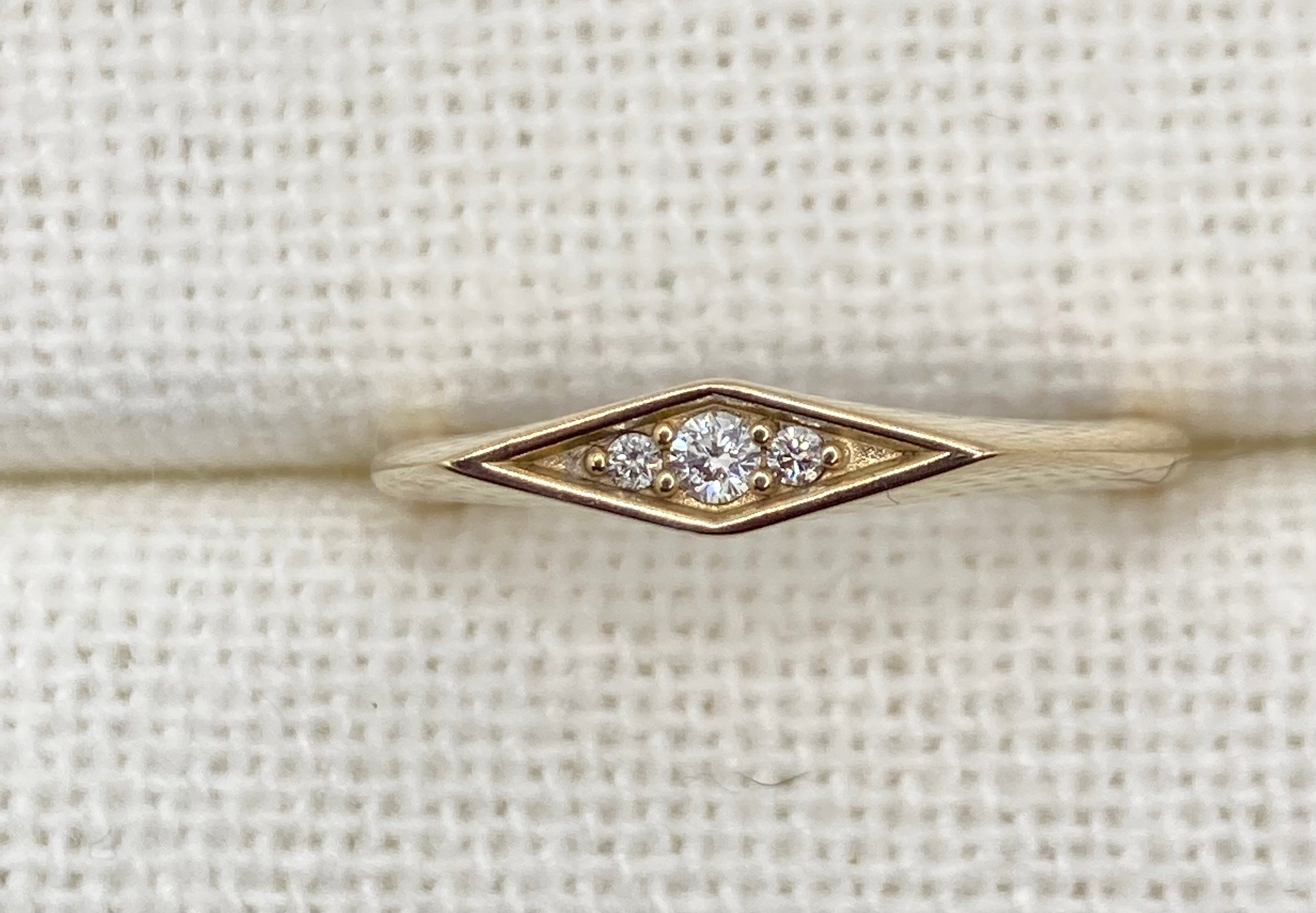 3 stone 14k yellow band that can be stacked with other rings or worn alone. This ring features .05ctw of lab grown diamonds. Currently at size 7 but can be resized at no charge. This ring can be made to order in different metal and stone combinations. Please send a message on the contact page for inquiries. Custom and made to order jewelry will take 4-6 weeks.