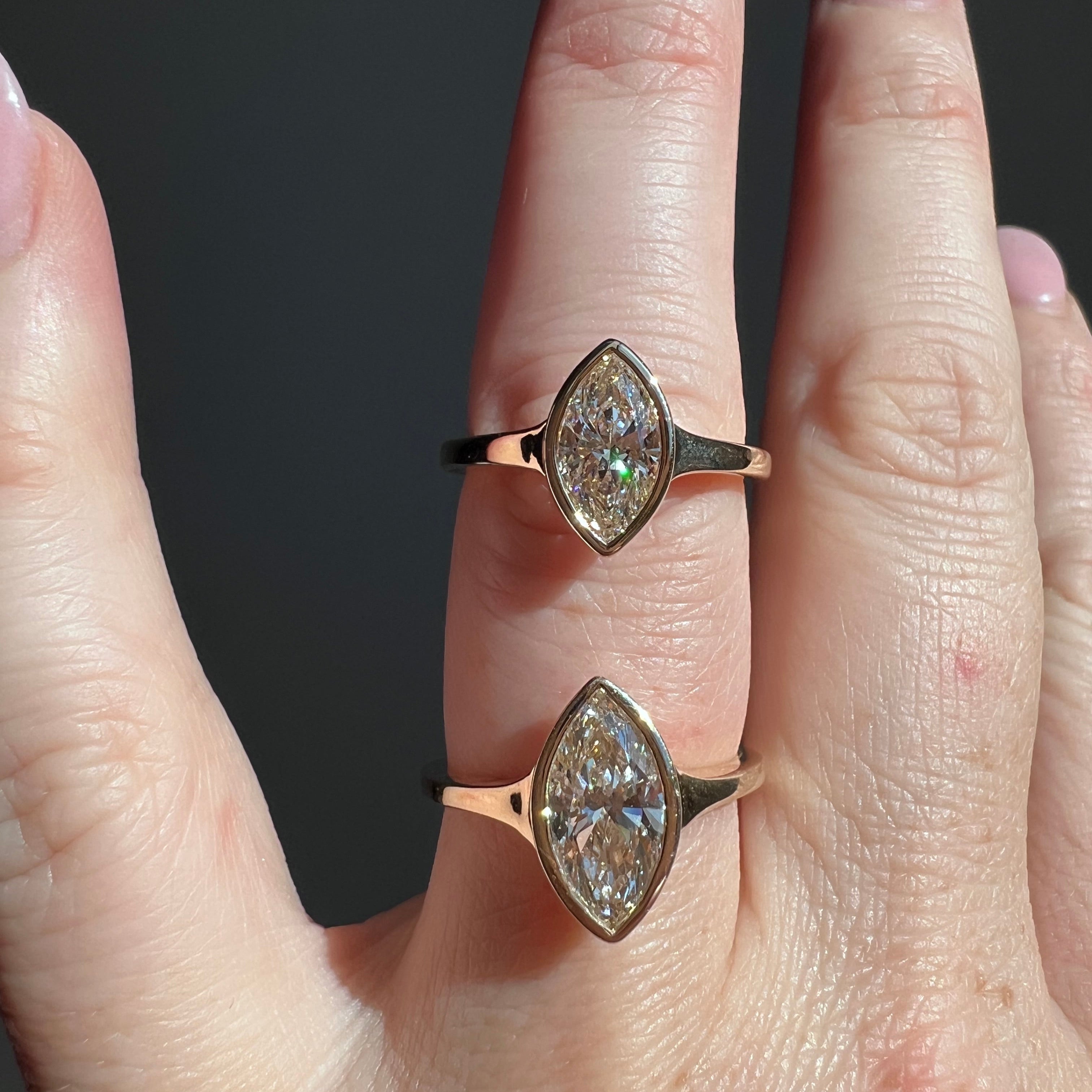 Timeless elegance meets modern design in this 1.14ct E VS1 lab diamond bezel set marquise ring. Perfect as an engagement ring or statement piece. The design allows for a straight band to sit below the center diamond to create the perfect stack from the wedding band to anniversary bands.