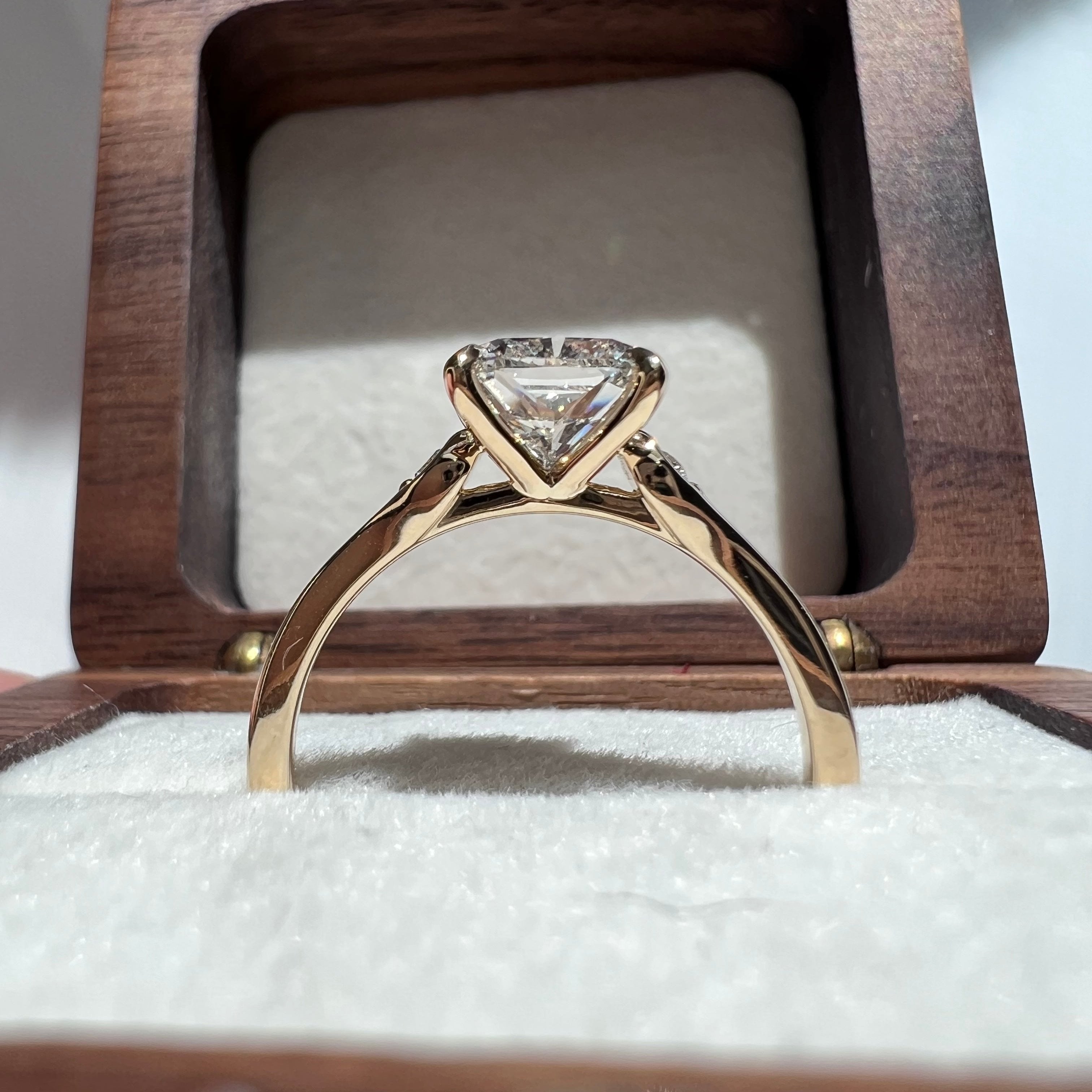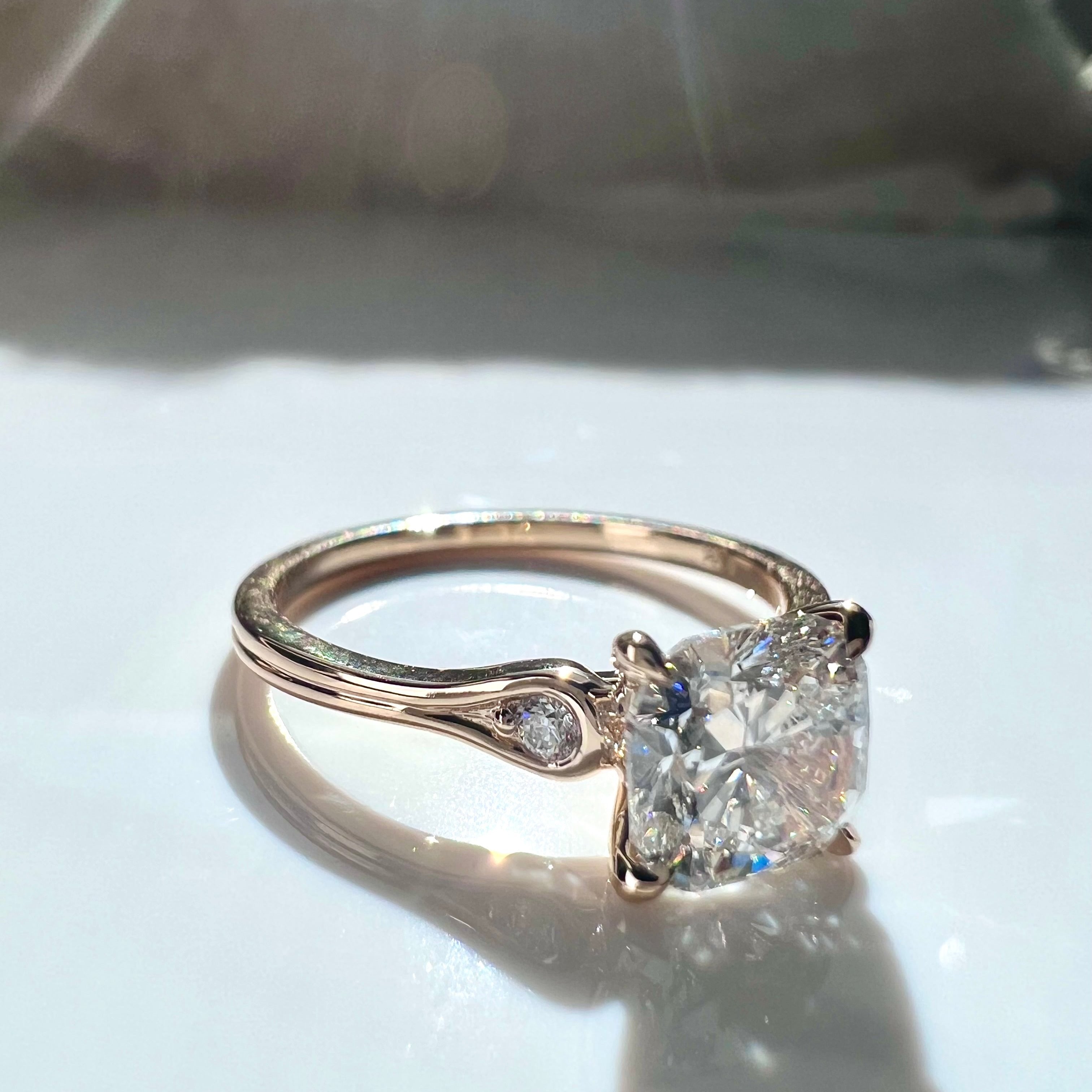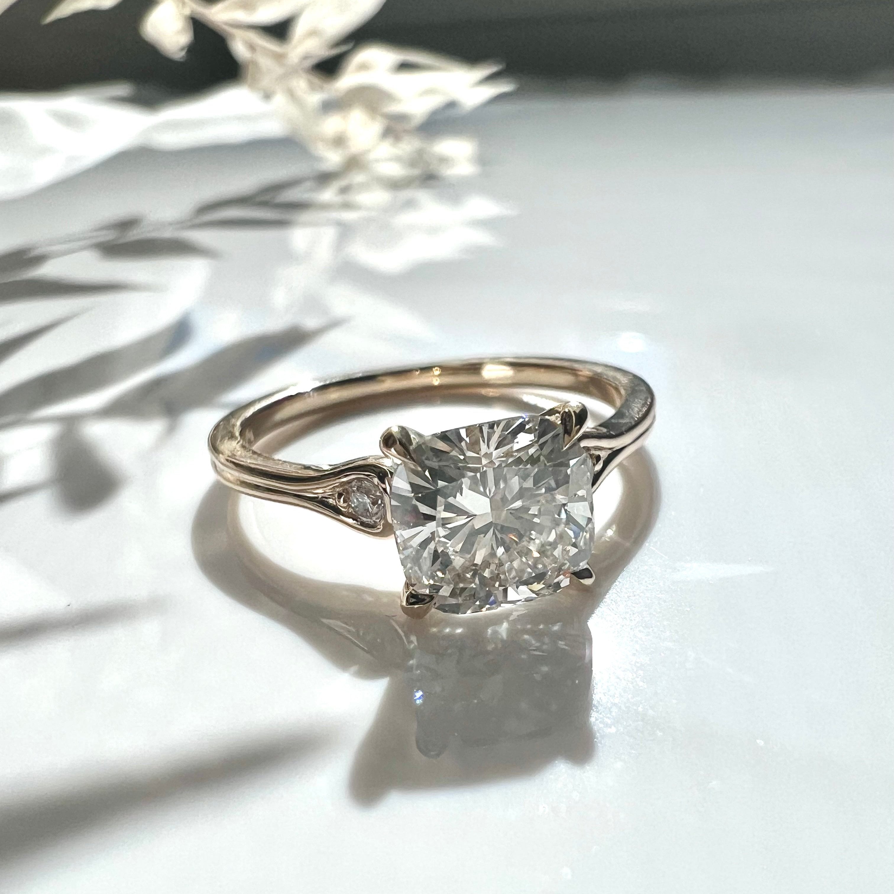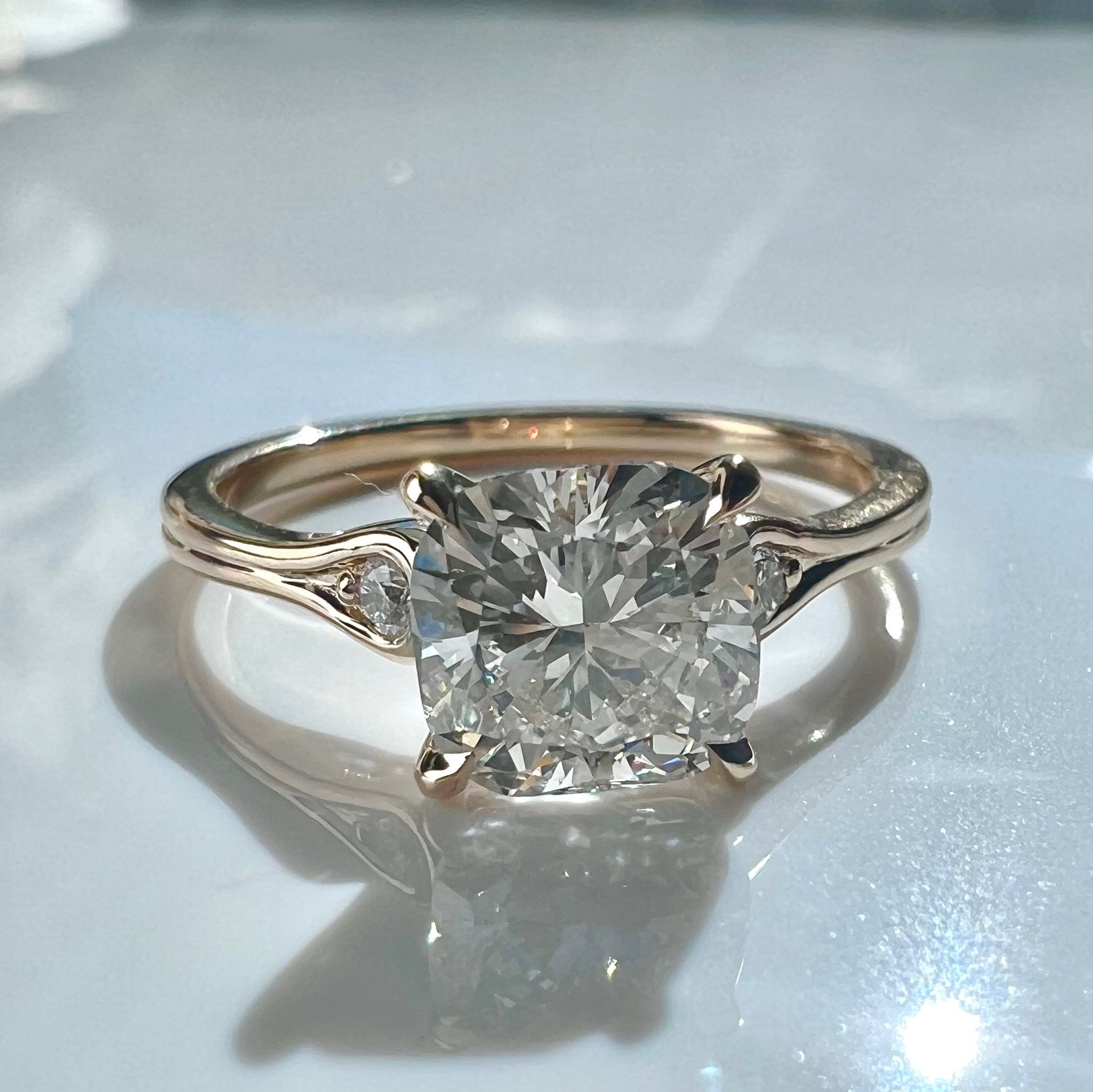 1.39 G VS1 Cushion lab diamond with 2- 1.7mm accent lab diamonds. Ring is currently size 7.