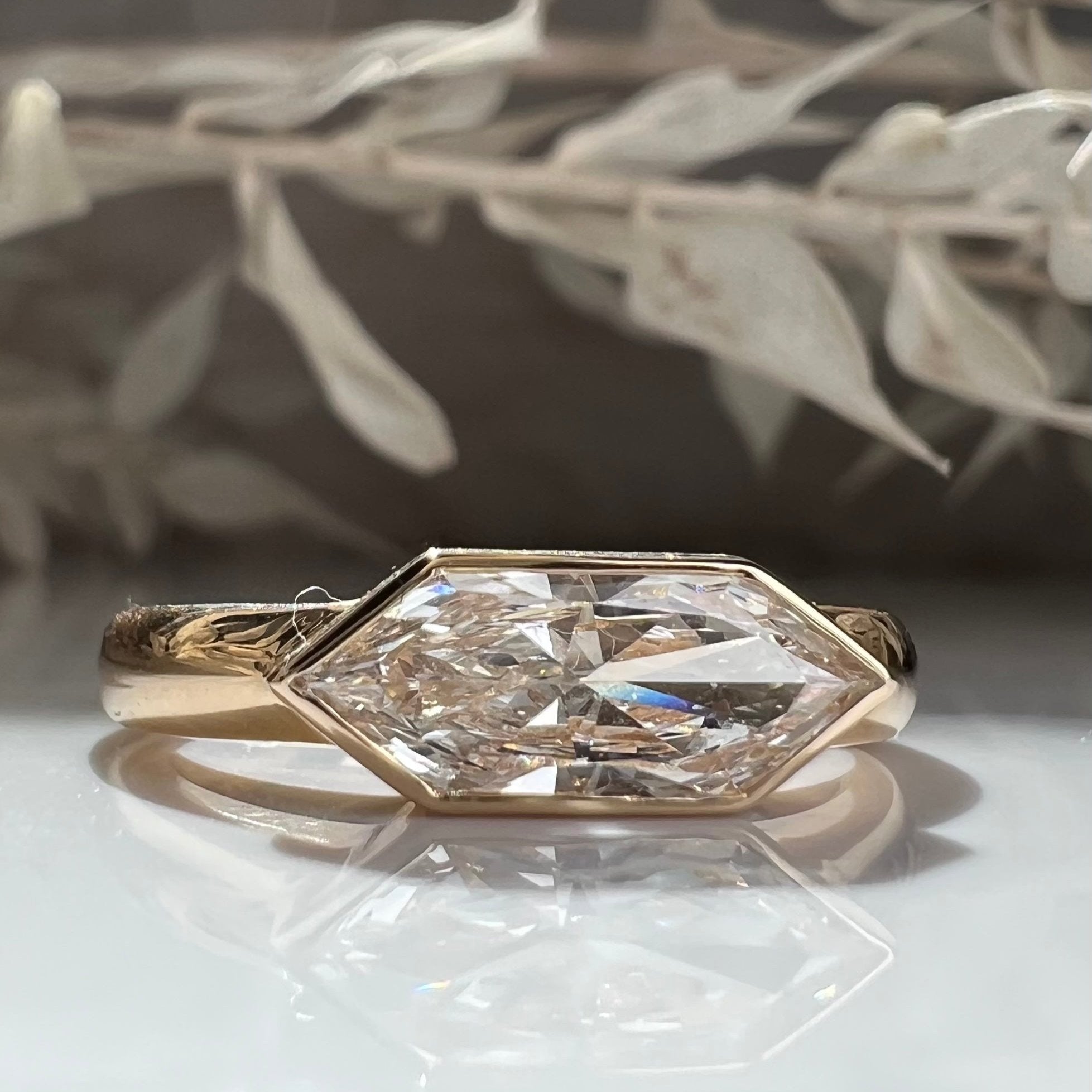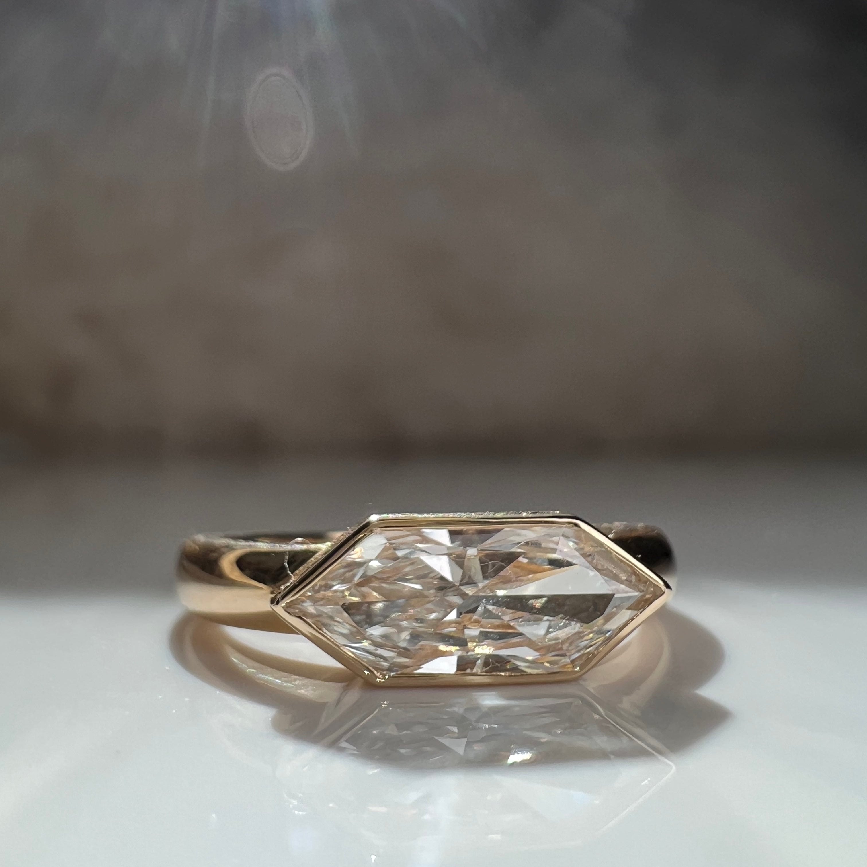 1.06 F VS1 Dutch Marquise lab diamond. Custom cut lab diamond bezel set on a wide band. This ring is gorgeous on any finger as a fashion ring or a unique engagement ring. Currently a size 6, free sizing available
