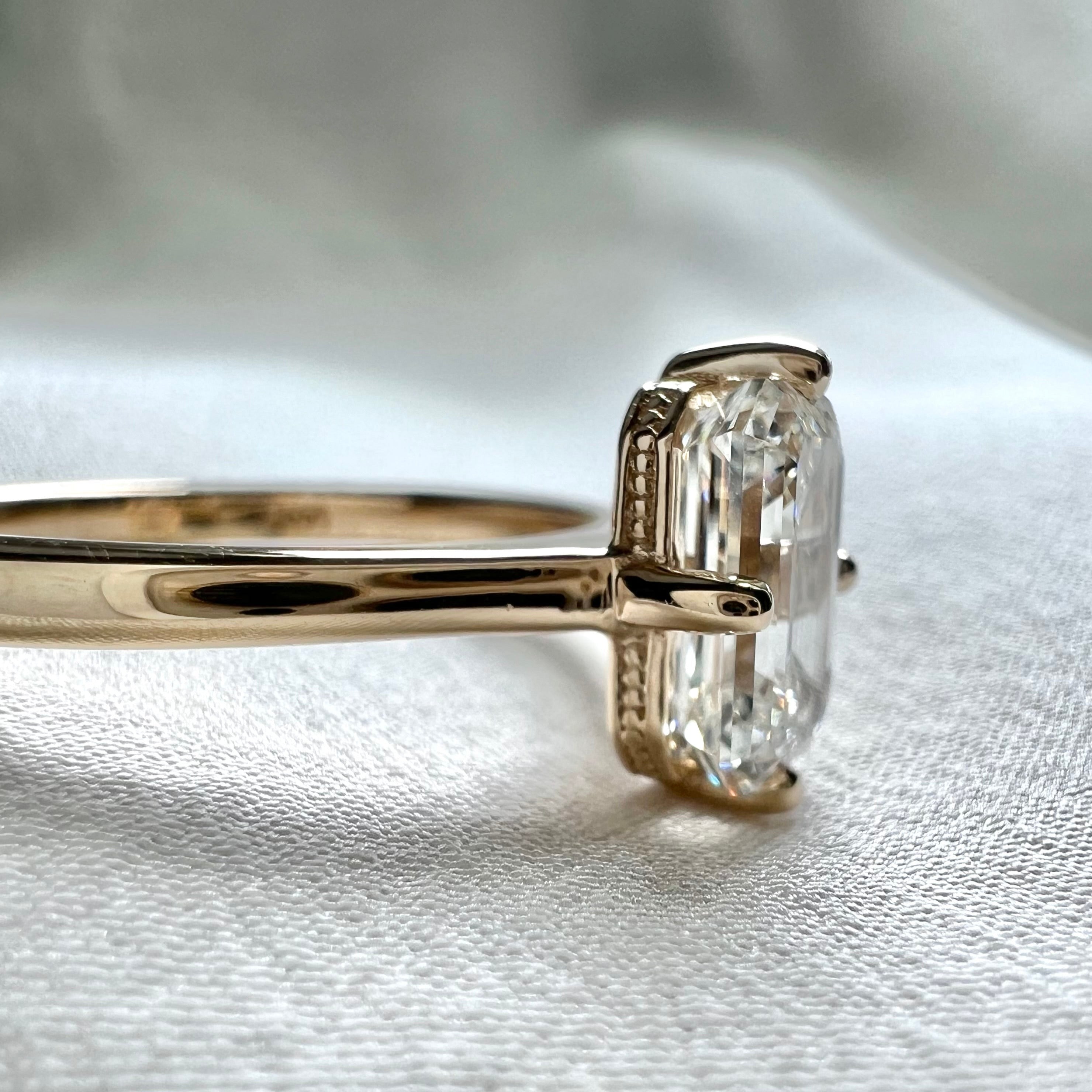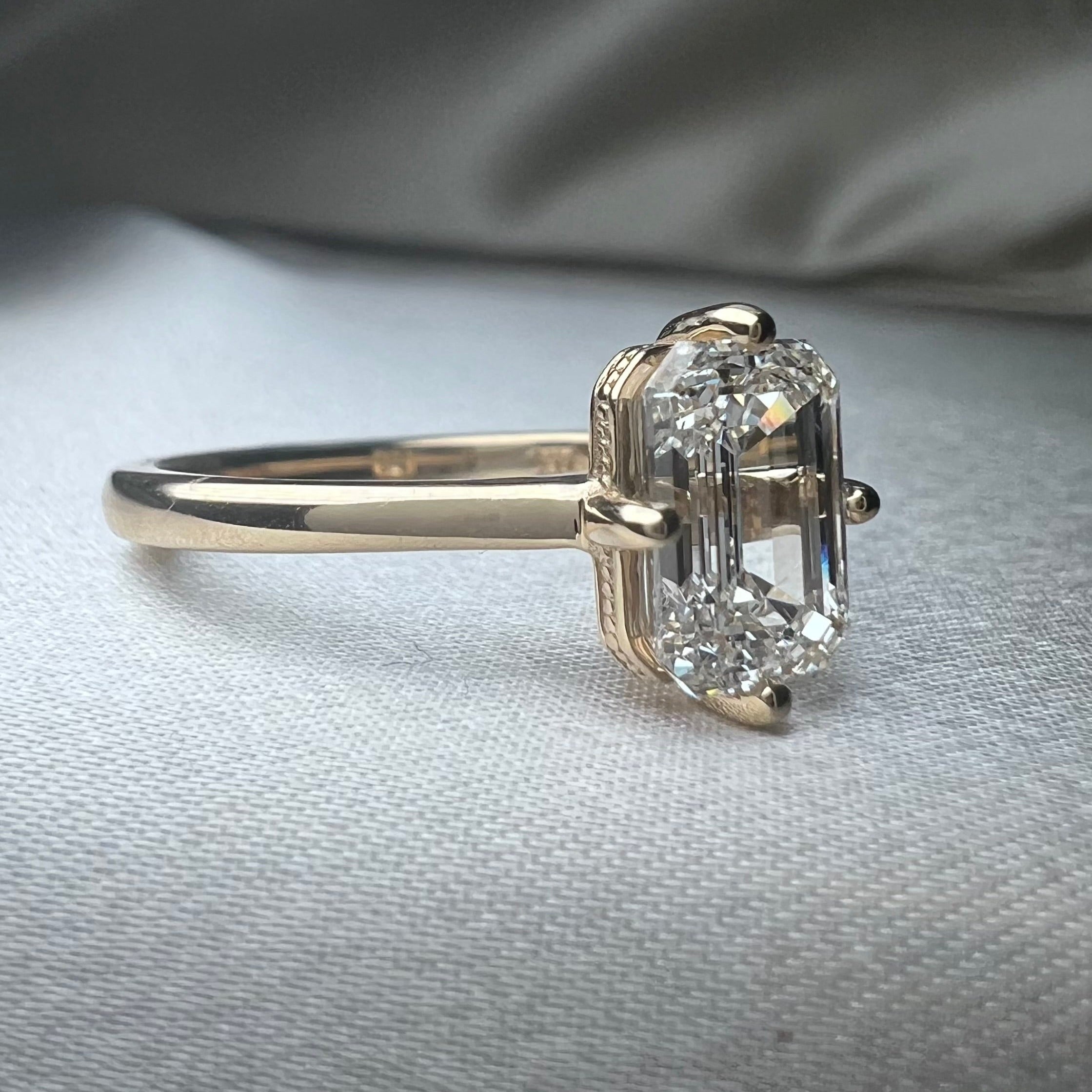 1.64 Carat IGI Certified Emerald Cut Lab Diamond Solitaire. Gorgeous hand selected diamond graded VVS2, G Color, Excellent cut. Compass point prong setting with hidden milgrain rail gives a simple twist on the classic emerald cut solitaire. This is designed for a straight band to be able to fit flush against it.