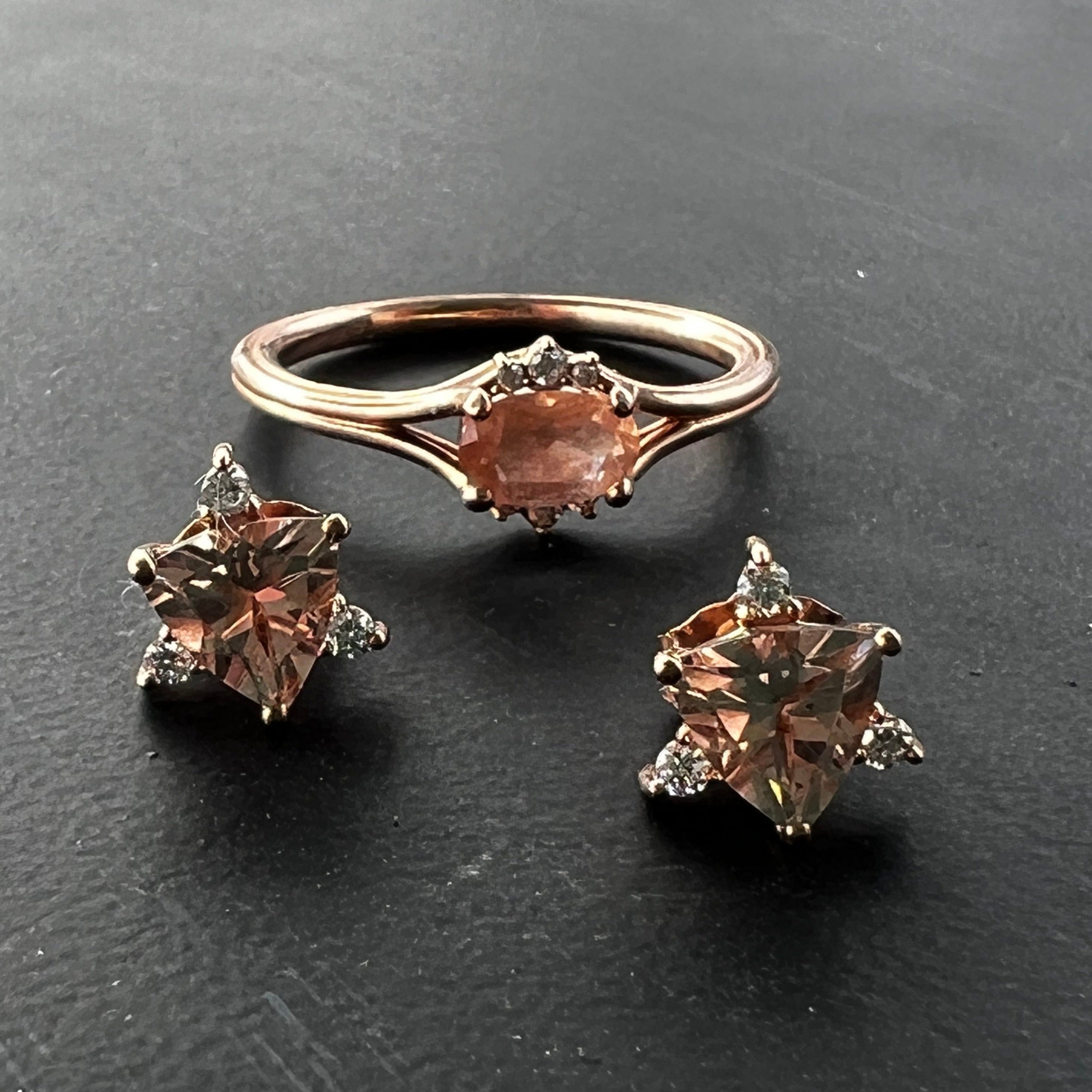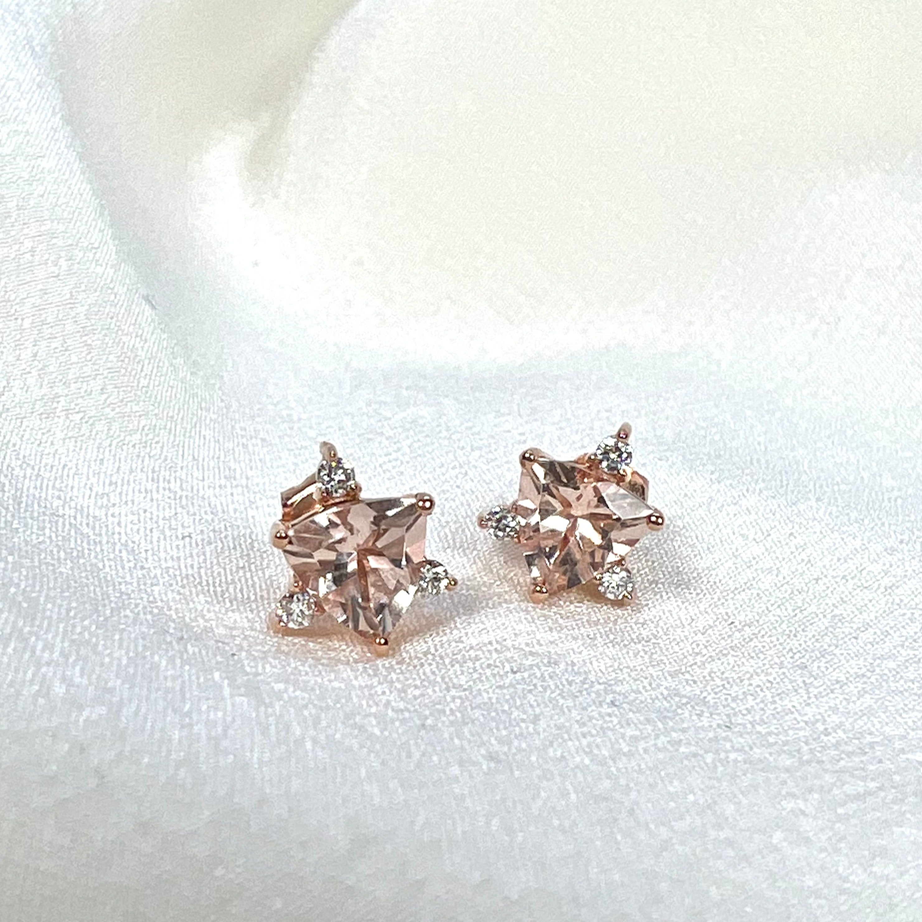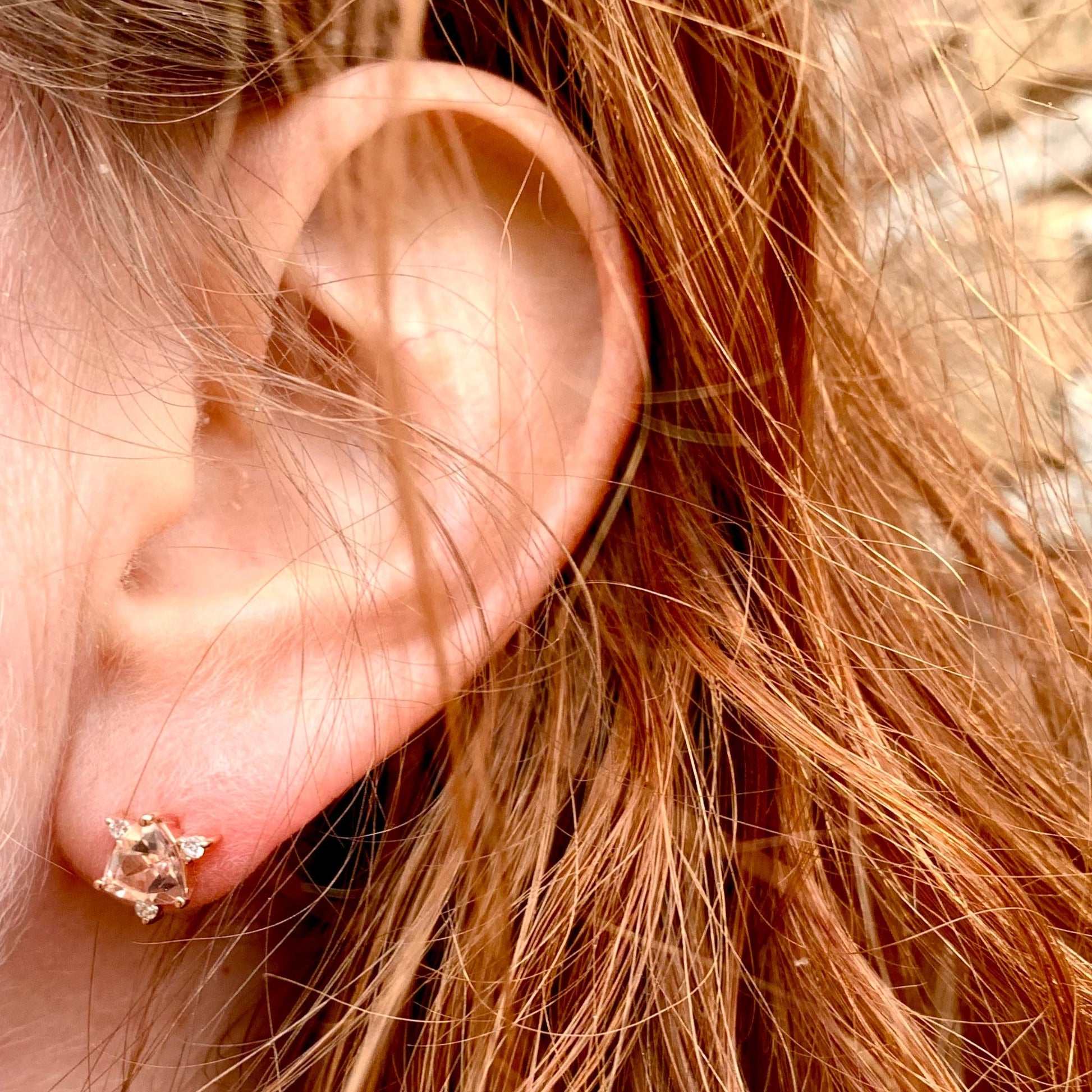 14k Rose gold earrings with trillion morganites and lab grown diamonds. These earrings are made with friction back. Purchase these ready to ship earrings or use them as inspiration for a custom piece.