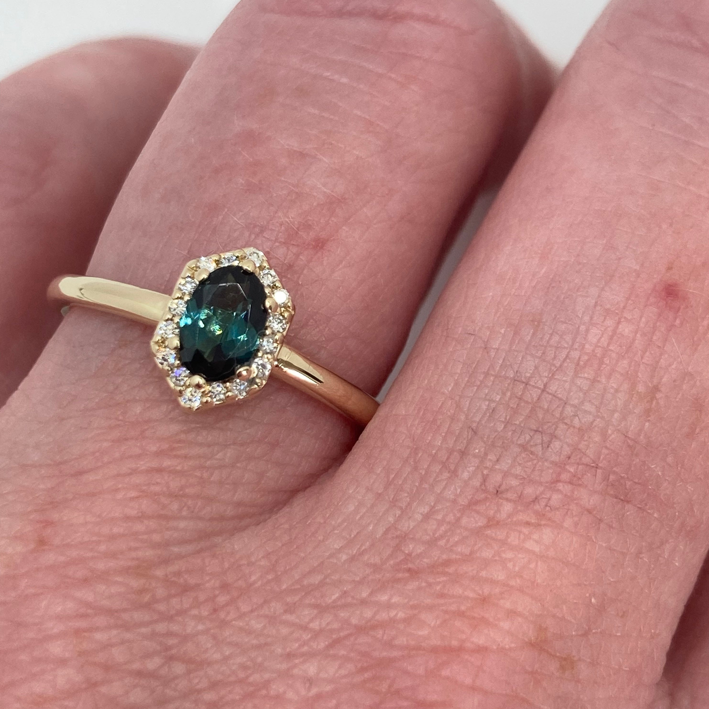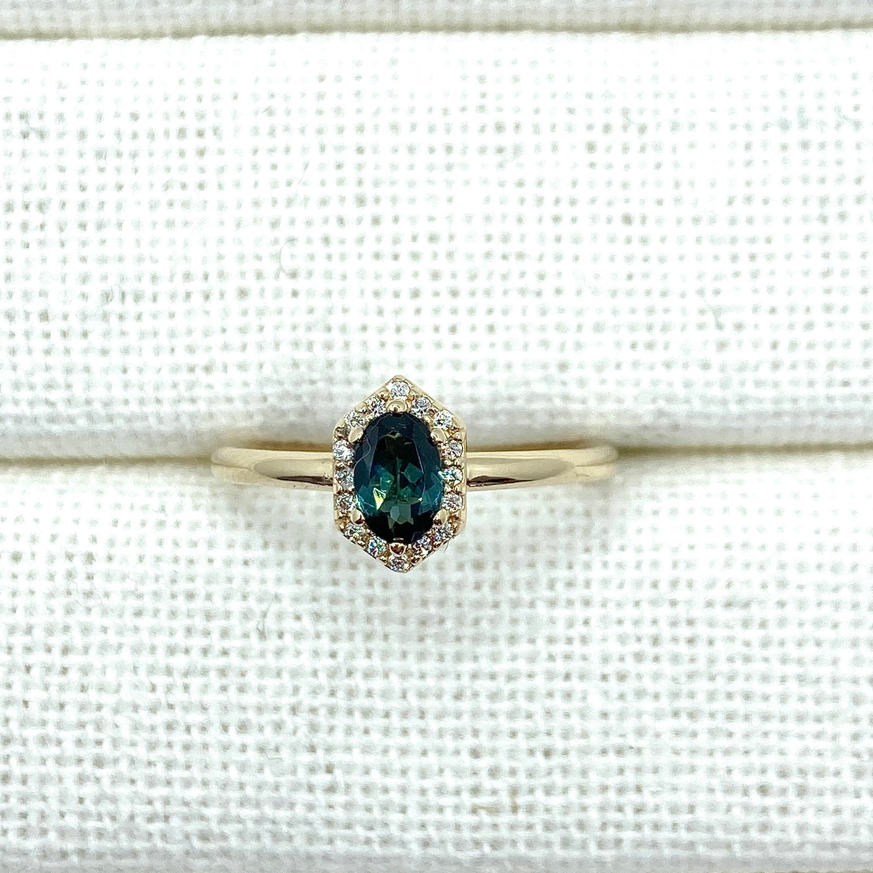 One of a kind teal sapphire ring in 14k yellow gold. This ring can be made to order in different metal and center stone combinations. Please send a message on the contact page for inquiries. Custom and made to order jewelry will take 4-6 weeks.