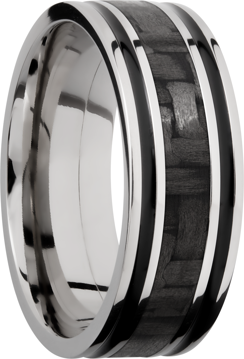 Titanium 8mm flat band with a 3mm inlay of black Carbon Fiber and 2, 1mm inlays of Cerakote