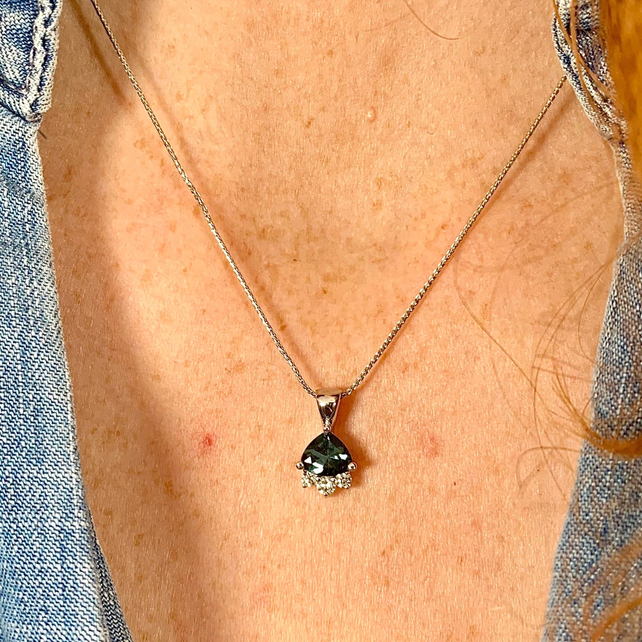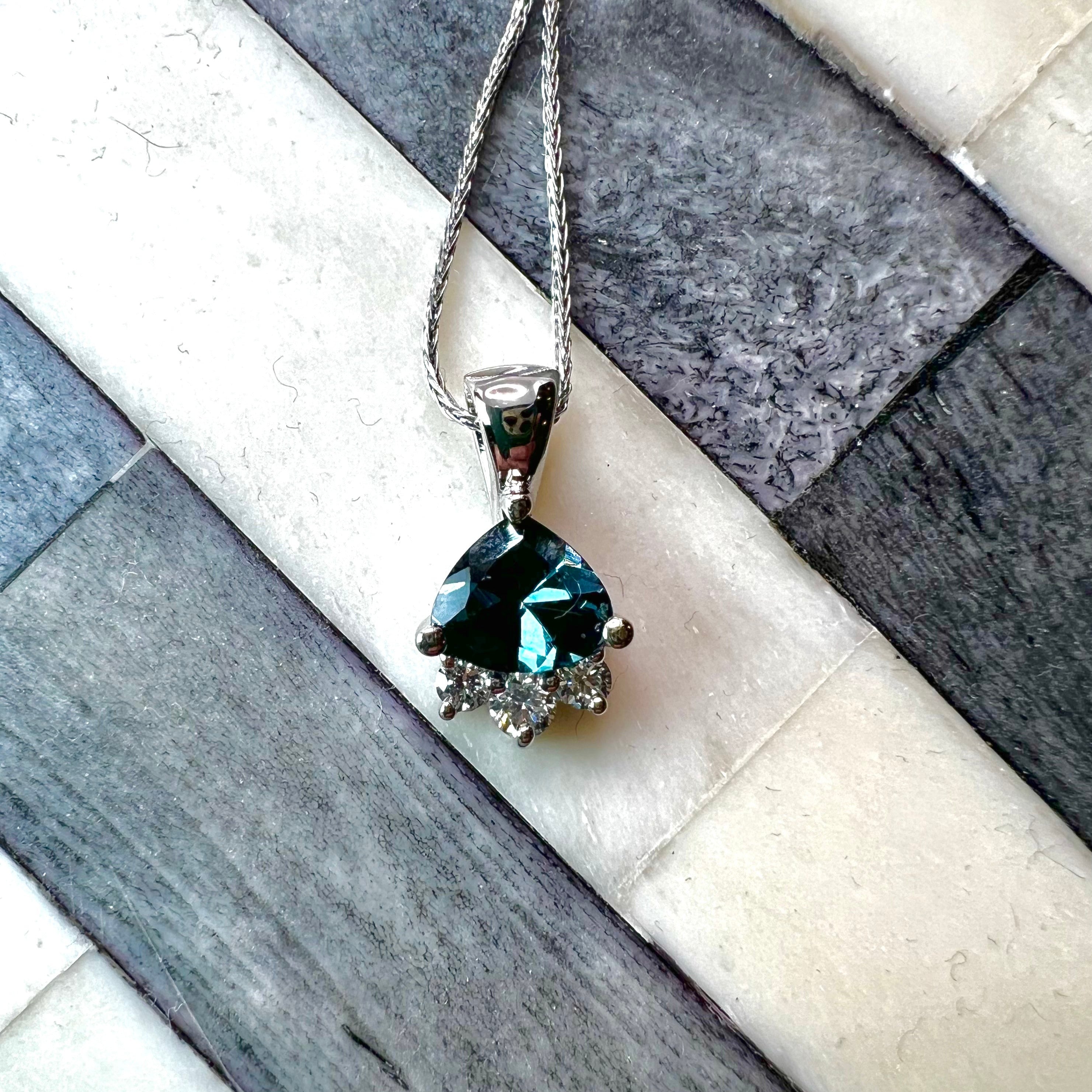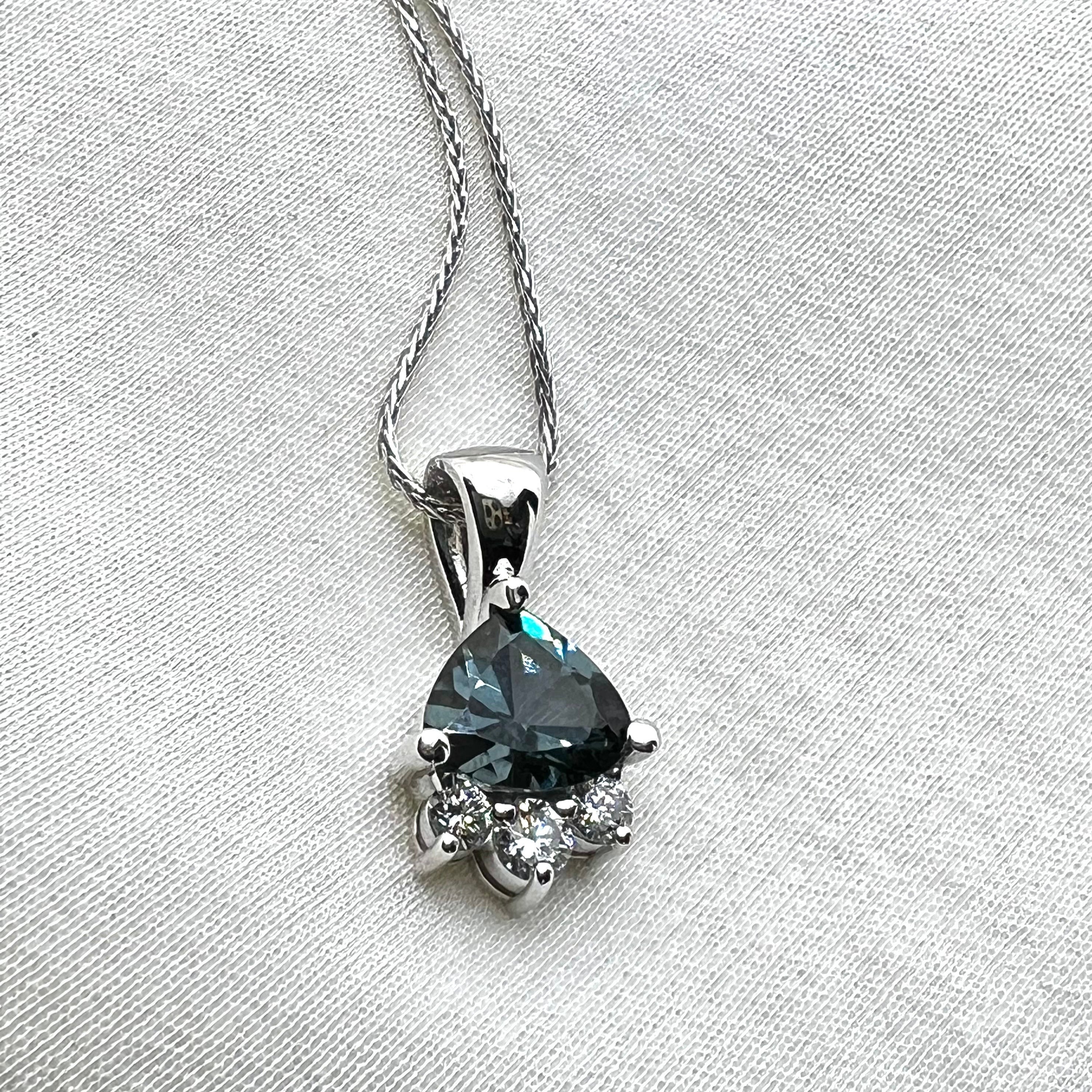 Beautiful blue gray spinel in one of a kind 14k white pendant with 3 lab grown diamonds. Comes with 18 inch 14k white chain.