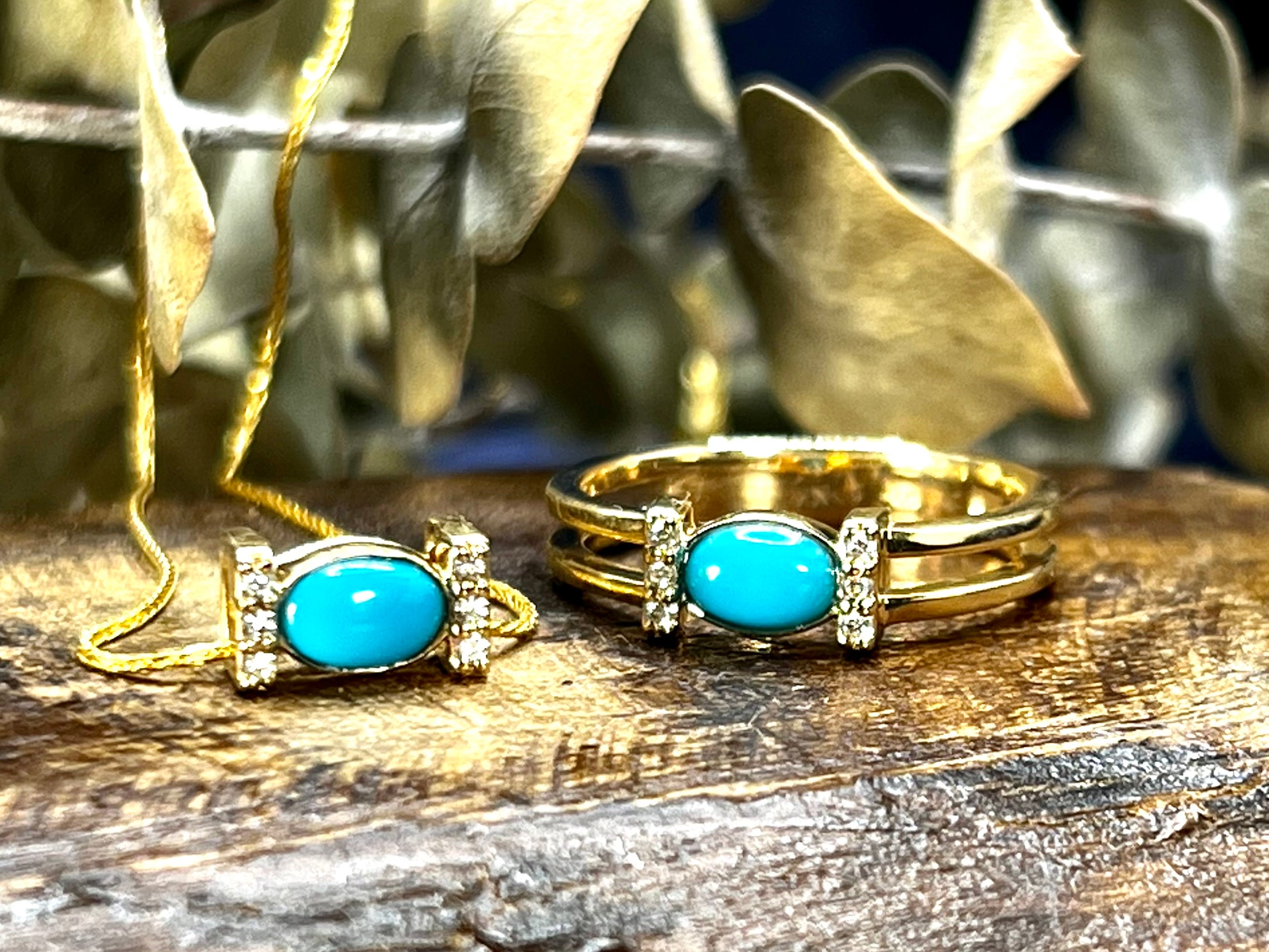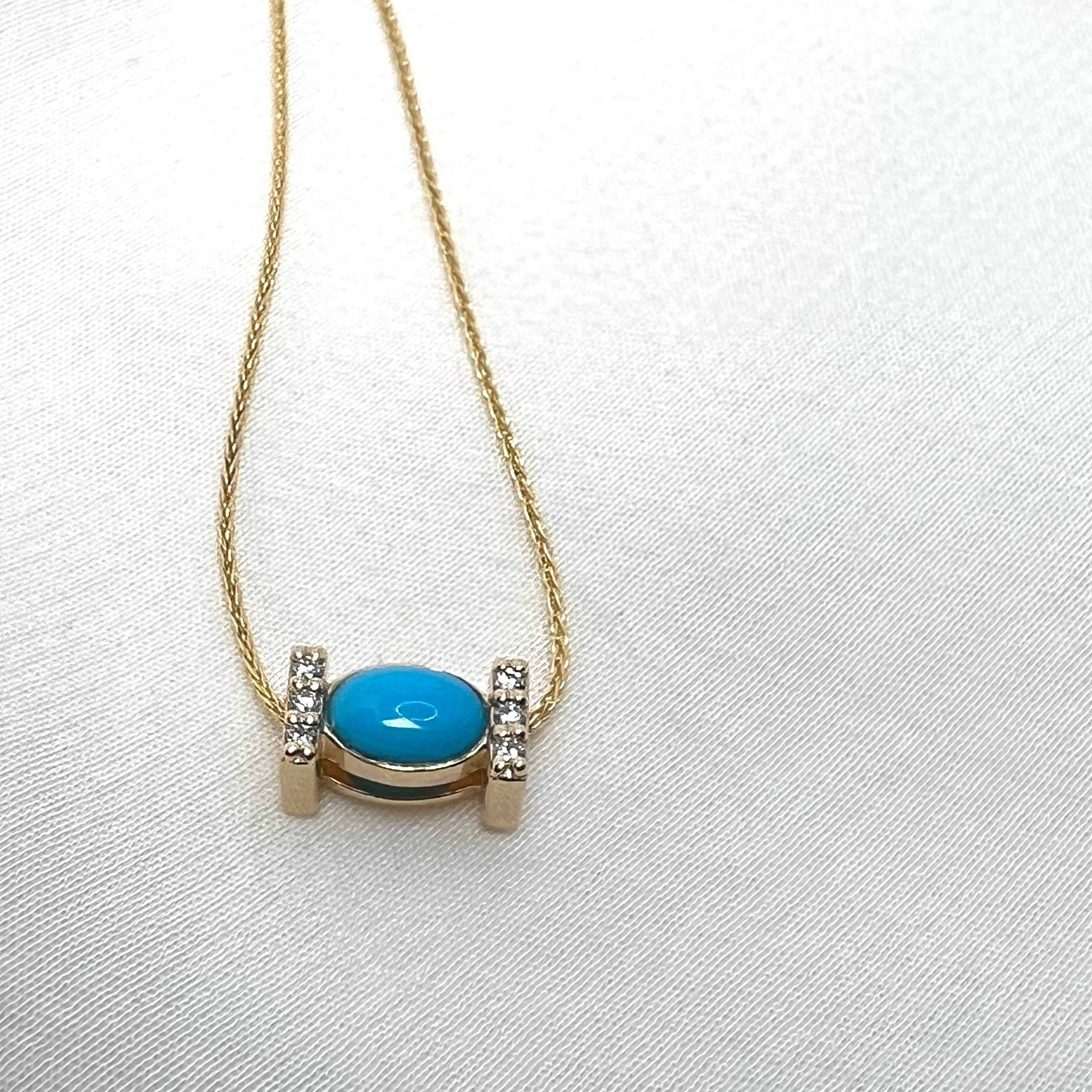 Modern cabochon turquoise and lab diamond pendant. Comes with 18 inch yellow gold chain as pictured. Purchase this necklace or use it as inspiration for a custom design. See matching turquoise ring and buy as a set.