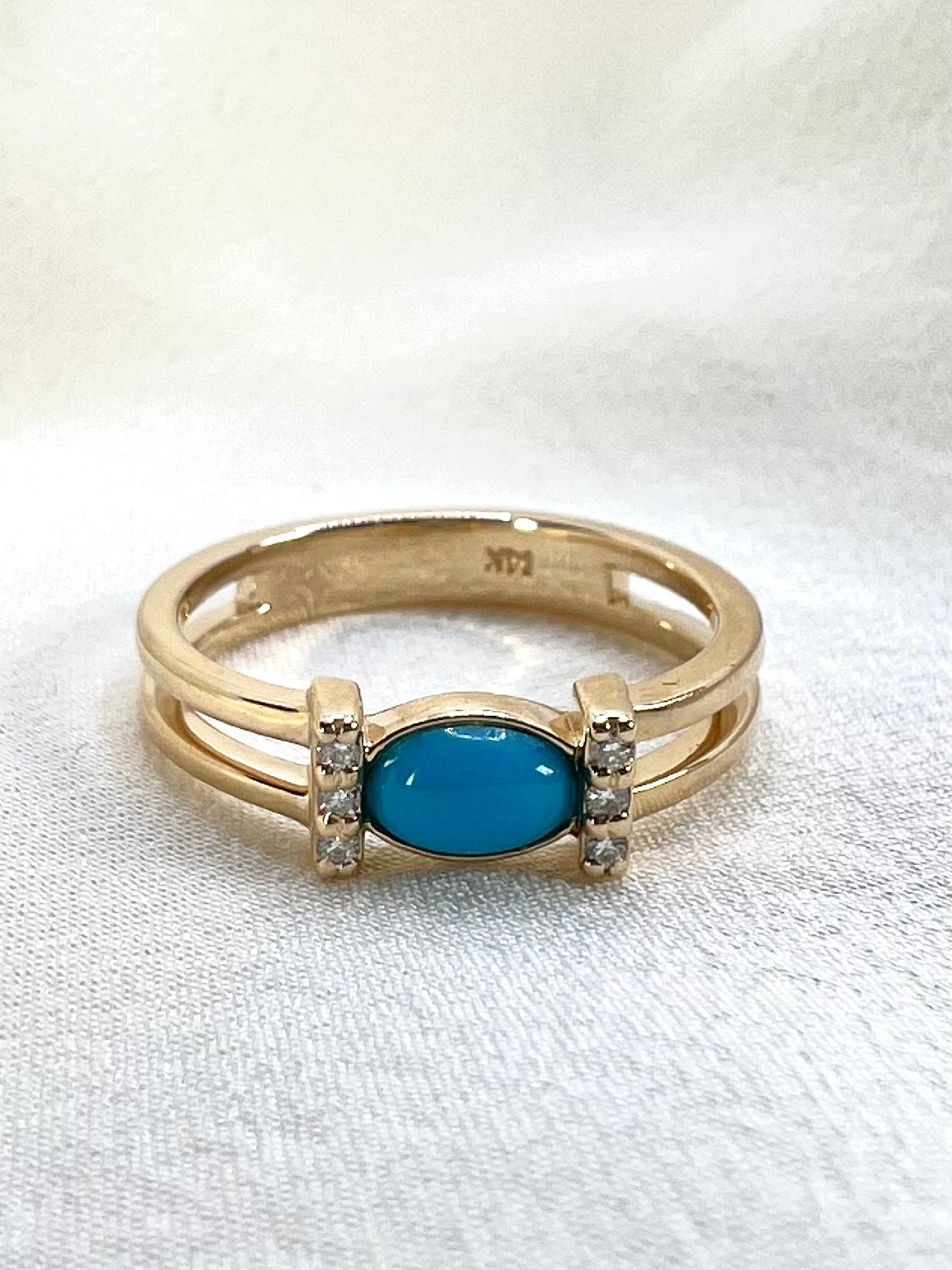 Turquoise cabochon with lab diamond accents. 14k yellow gold double band with horizontally set turquoise creates a unique modern ring. Solid construction made to last for daily wear. Pair it with matching necklace to complete the look.