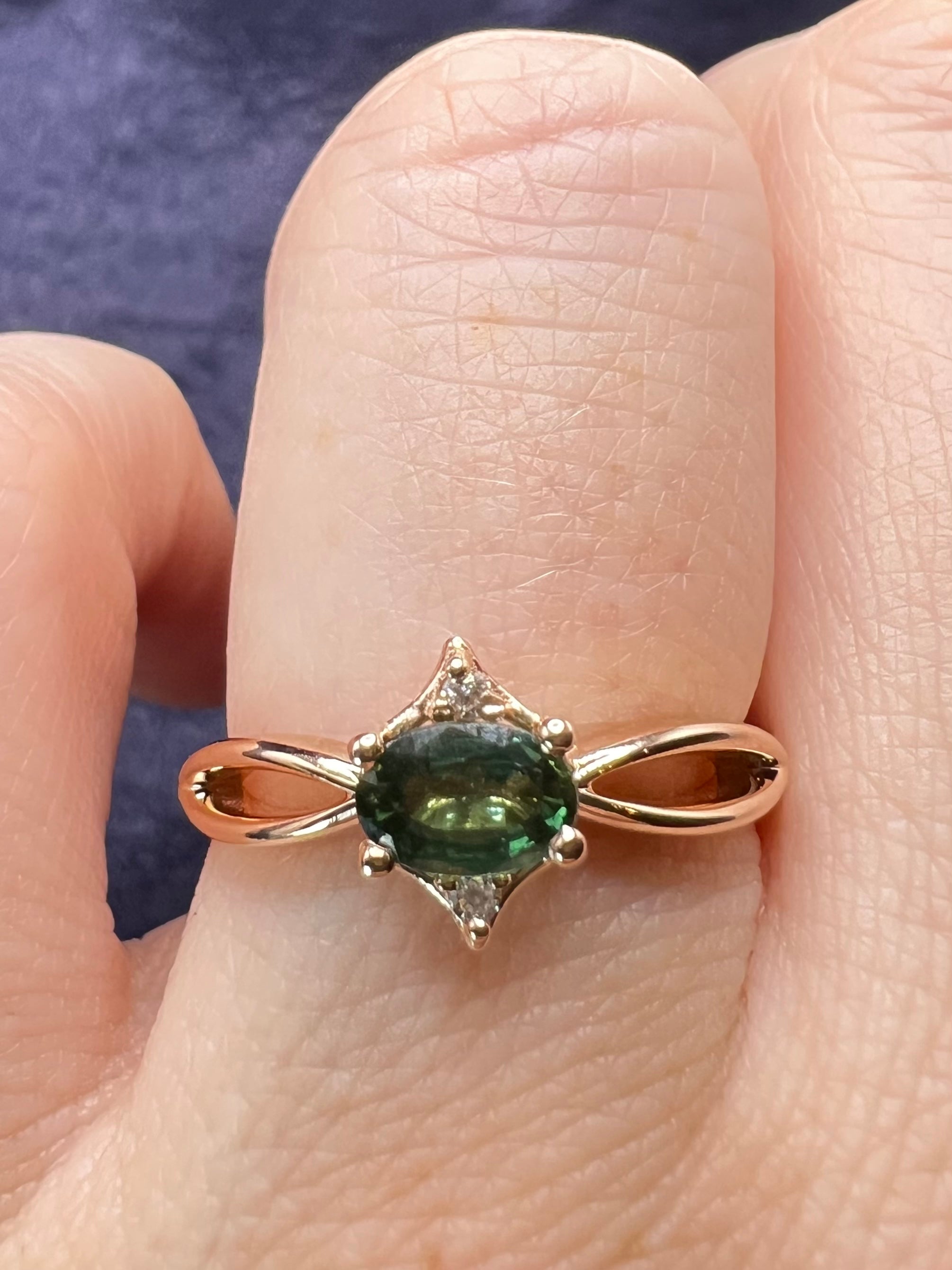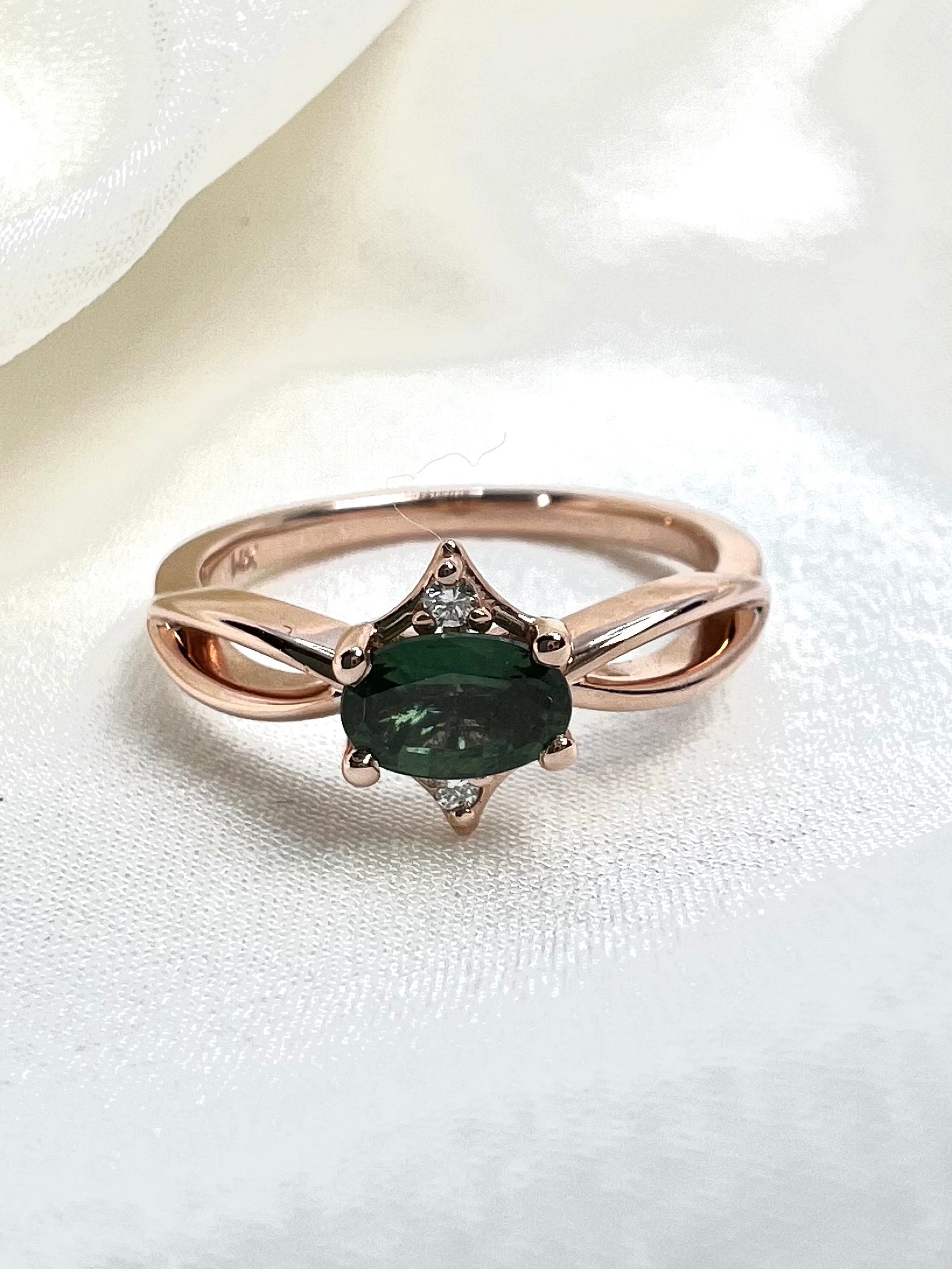 6x4 Oval Teal Sapphire in 14k rose gold open shank and lab diamond accents. Purchase ring as is or use it as inspiration for a custom piece. Current size 7 and eligible for 1 time free sizing.