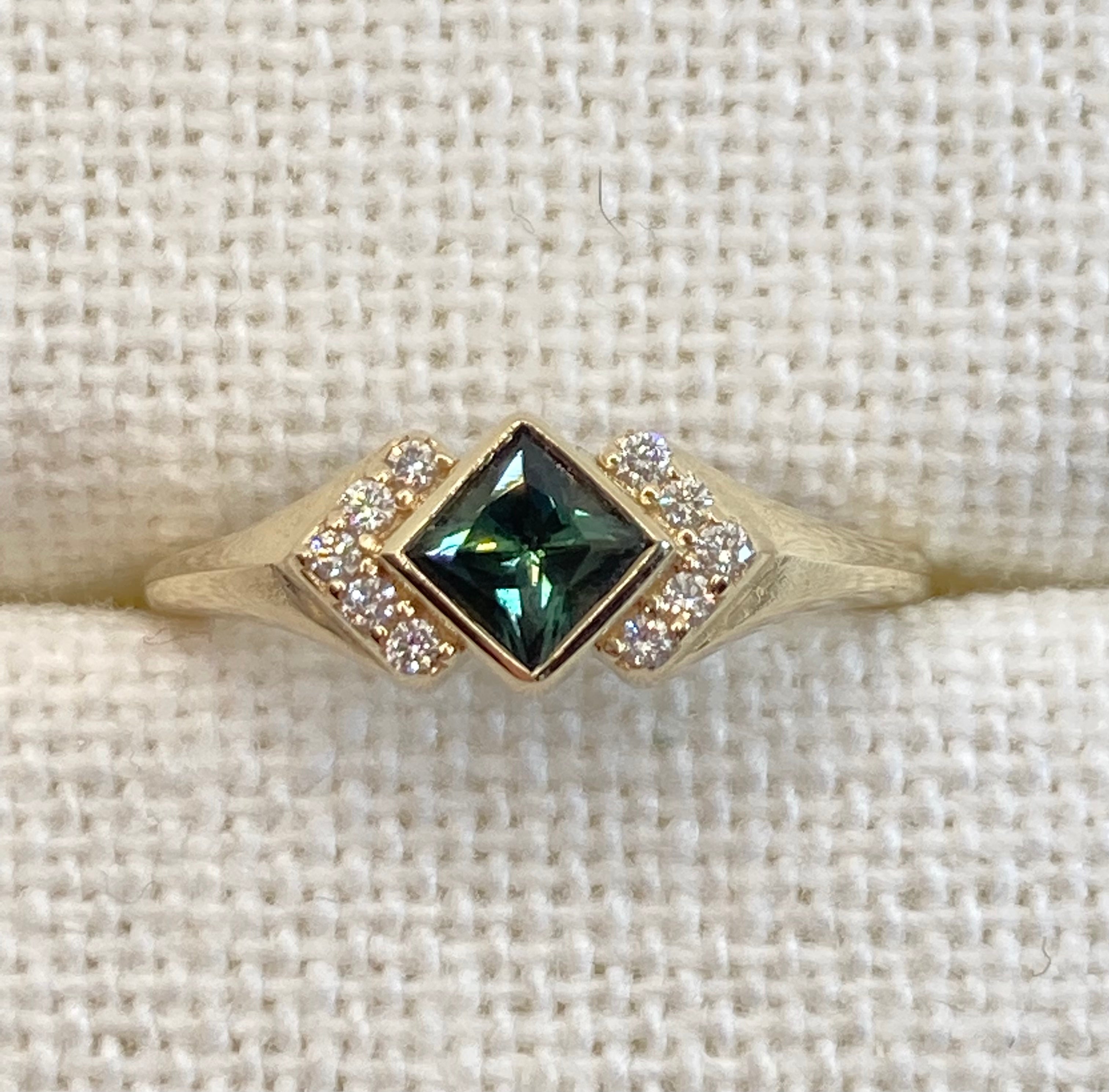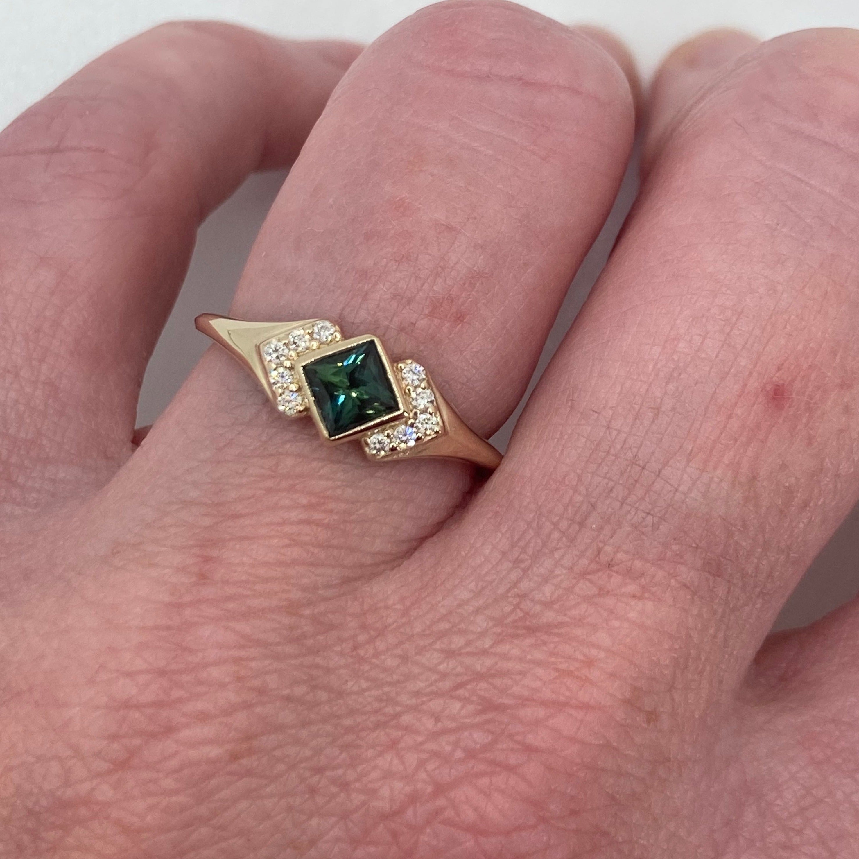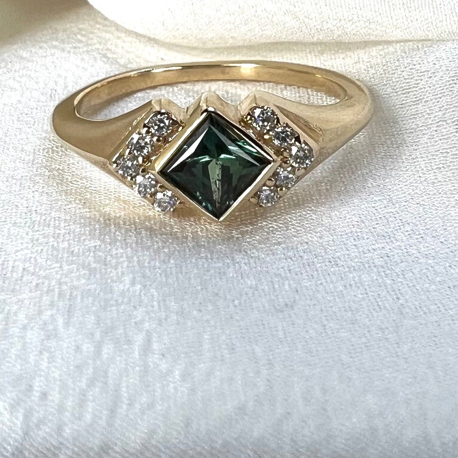 Teal sapphire in a bezel setting with lab diamonds. Currently at size 7 but can be resized at no charge. This ring can be made to order in different metal and center stone combinations. Please send a message on the contact page for inquiries. Custom and made to order jewelry will take 4-6 weeks.