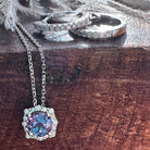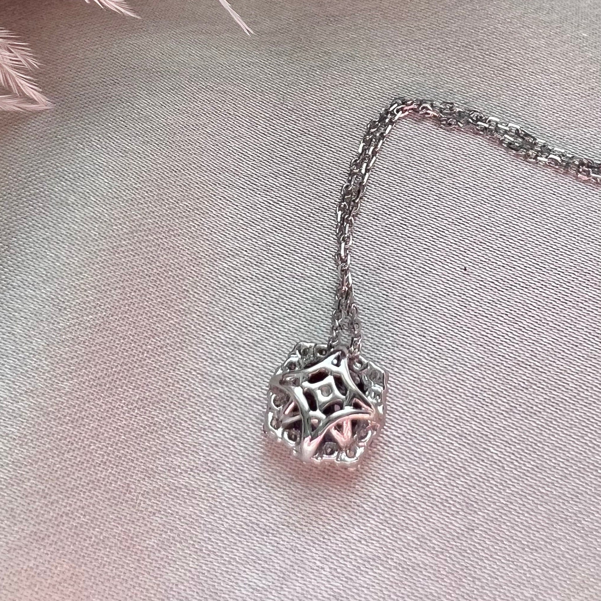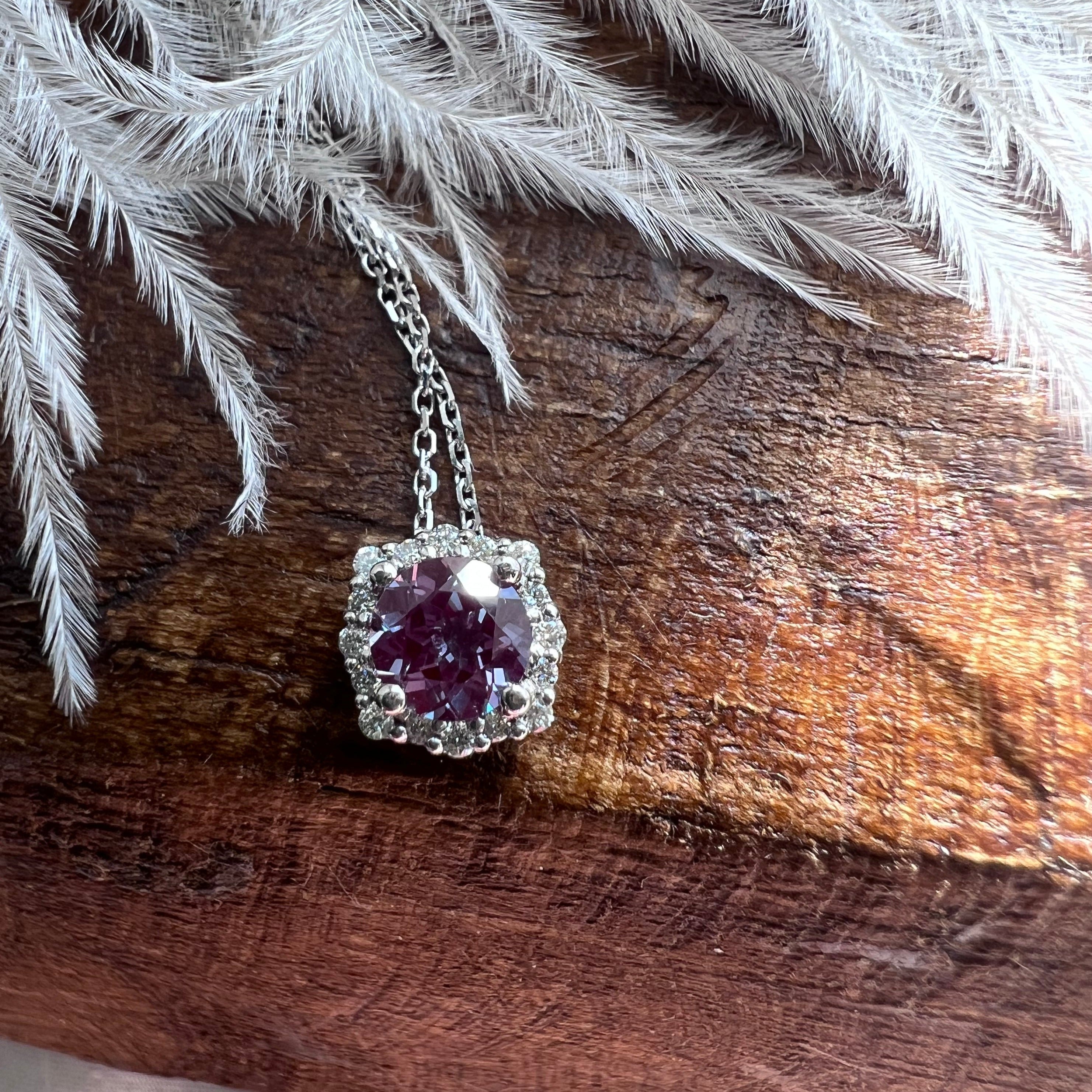 .50ct color changing lab alexandrite pendant in 14k white gold. .10ctw diamond with 18 inch chain.
