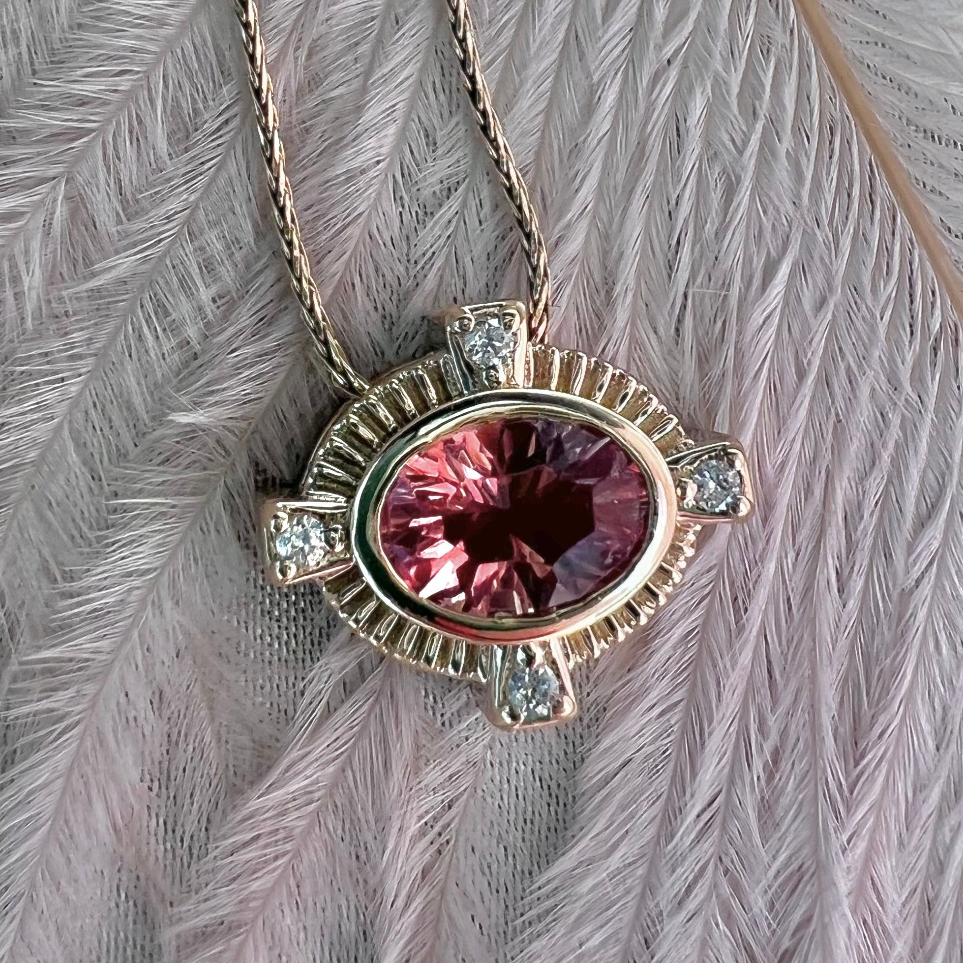 .79ct Sunstone pendant with .04ctw lab diamonds on 18 inch 14k yellow gold chain. This chain can be worn vertical or horizonal.